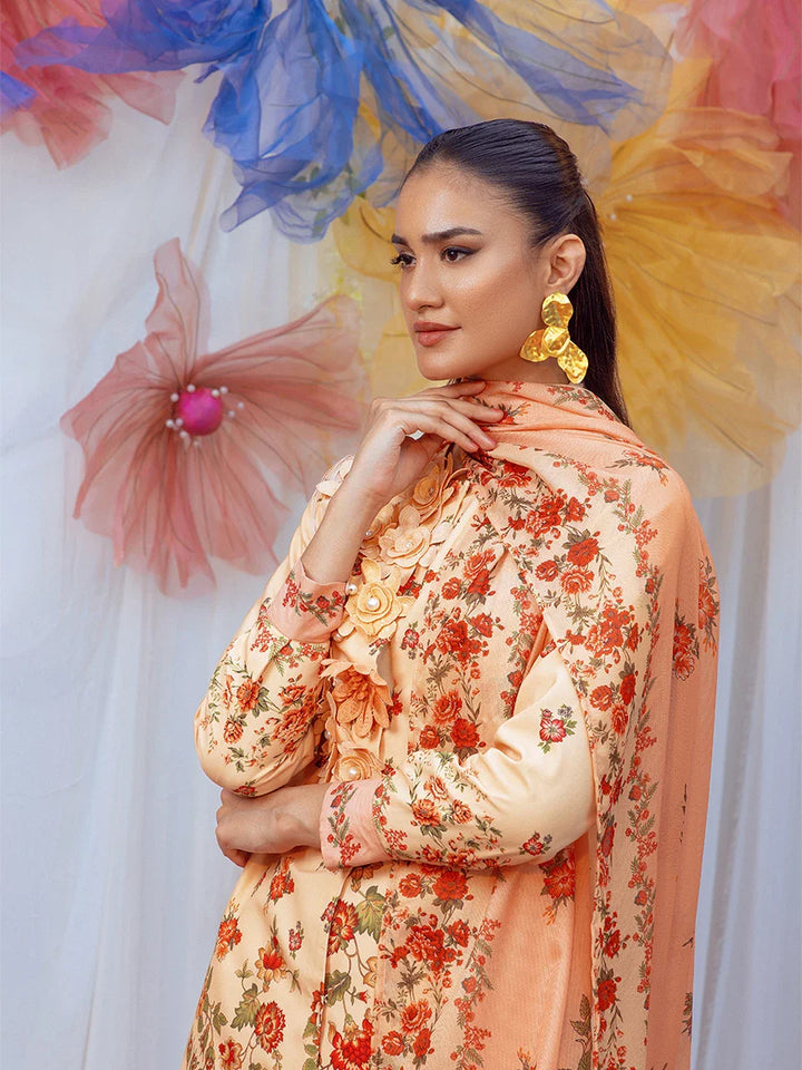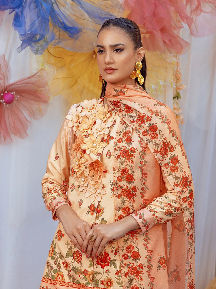 Step into sophistication with our stunning peach-printed 3-piece, featuring a beautifully designed lawn silk shirt and a matching printed net dupatta – a perfect balance of grace and style