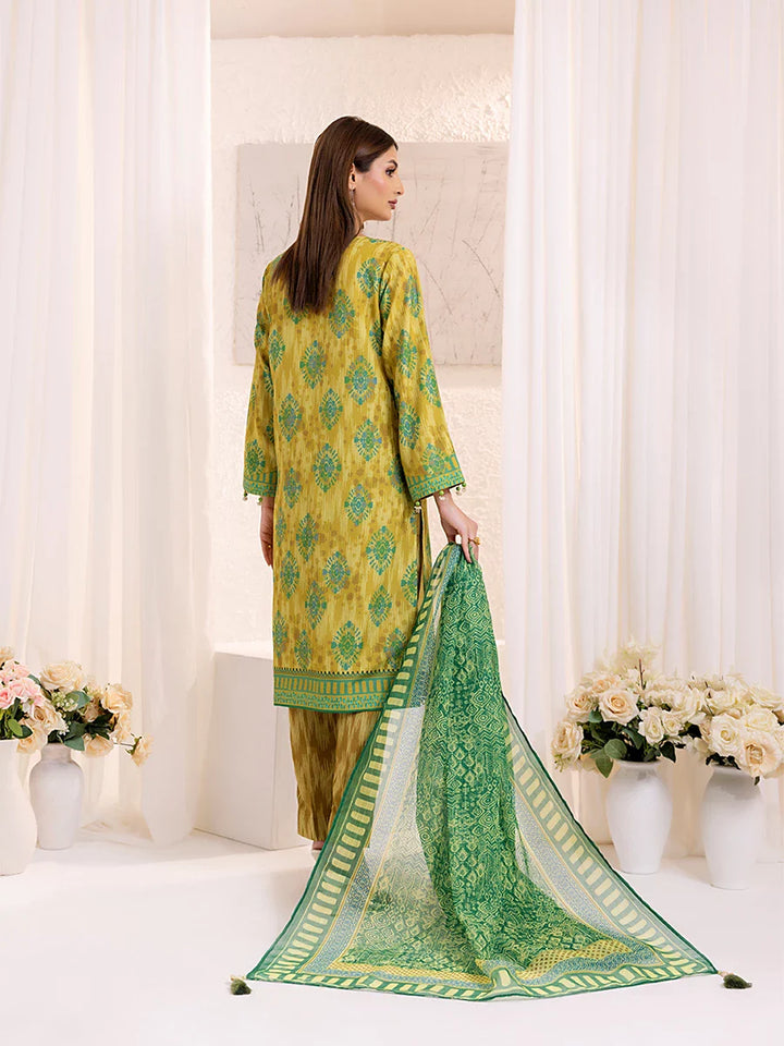Elegant 3-piece suit in premium printed lawn silk. Includes a breathable shirt, trousers, and a lightweight dupatta. Perfect for any occasion.