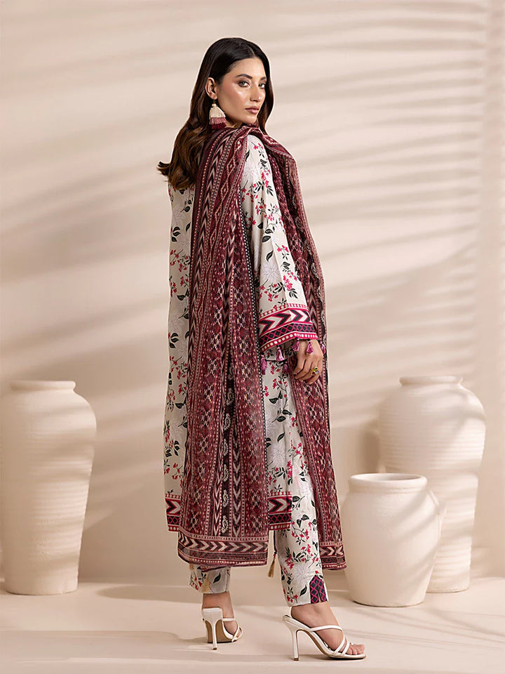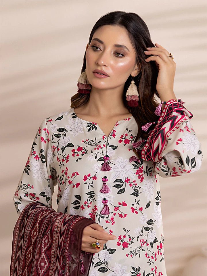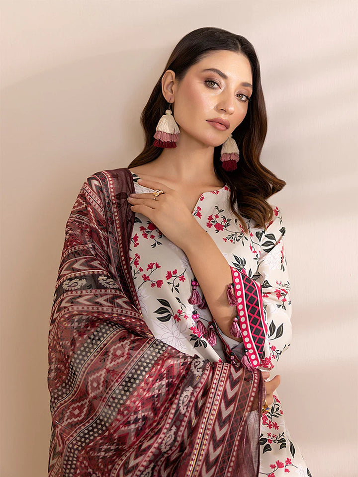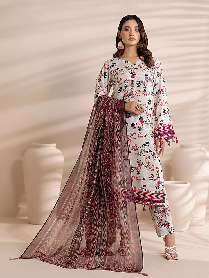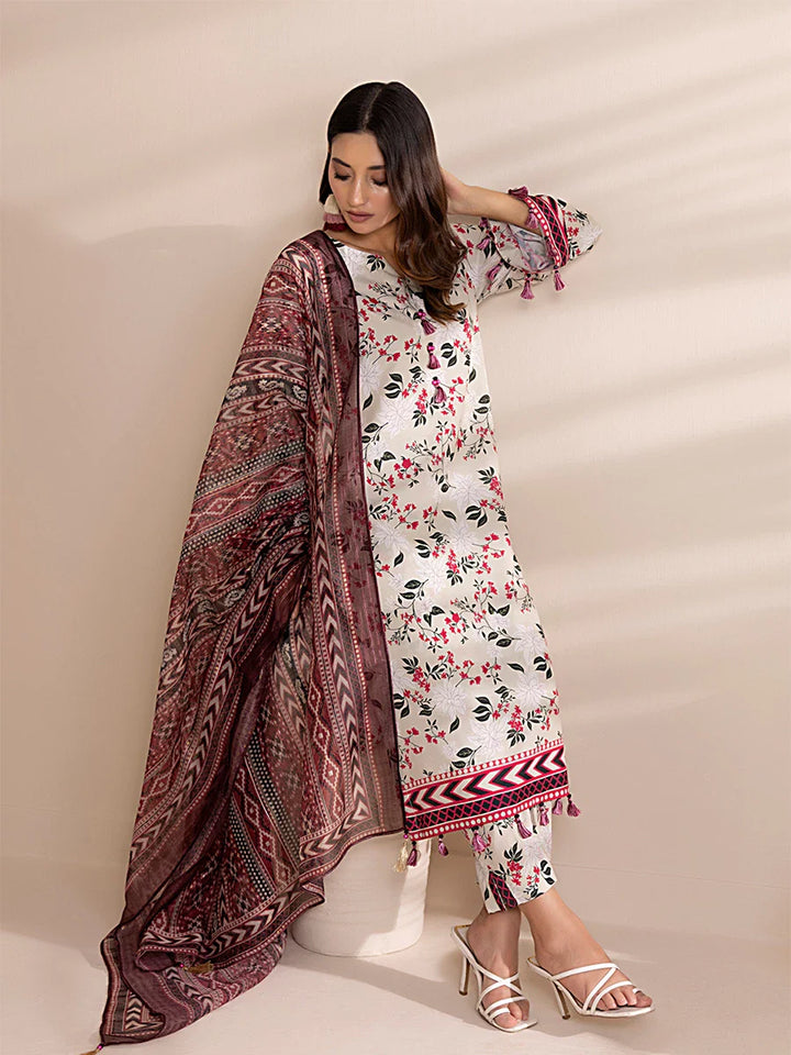 Elegant 3-piece suit in premium printed lawn silk. Includes a breathable shirt, trousers, and a lightweight dupatta. Perfect for any occasion.