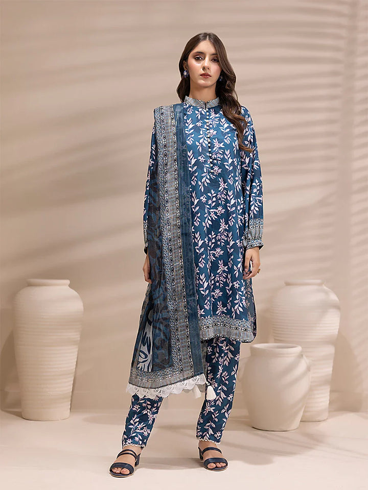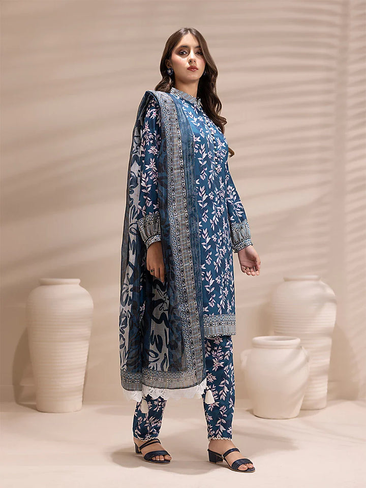 Elegant 3-piece suit in premium printed lawn silk. Includes a breathable shirt, trousers, and a lightweight dupatta. Perfect for any occasion.