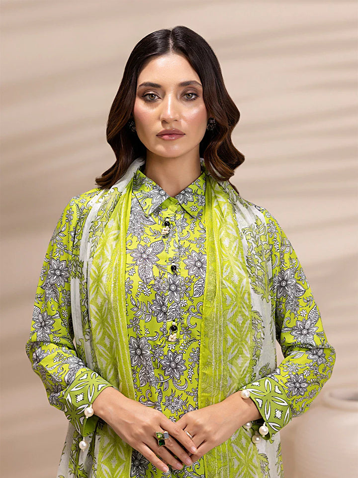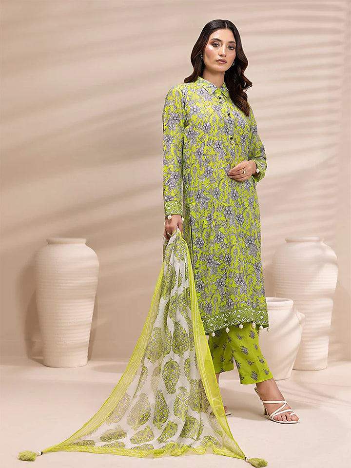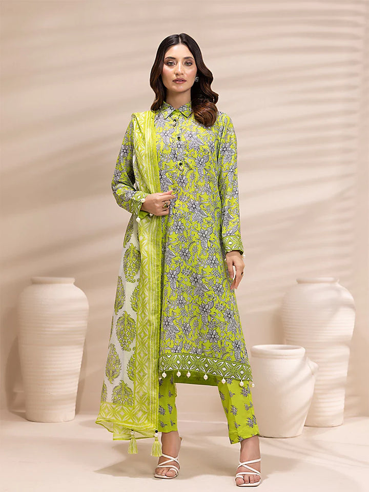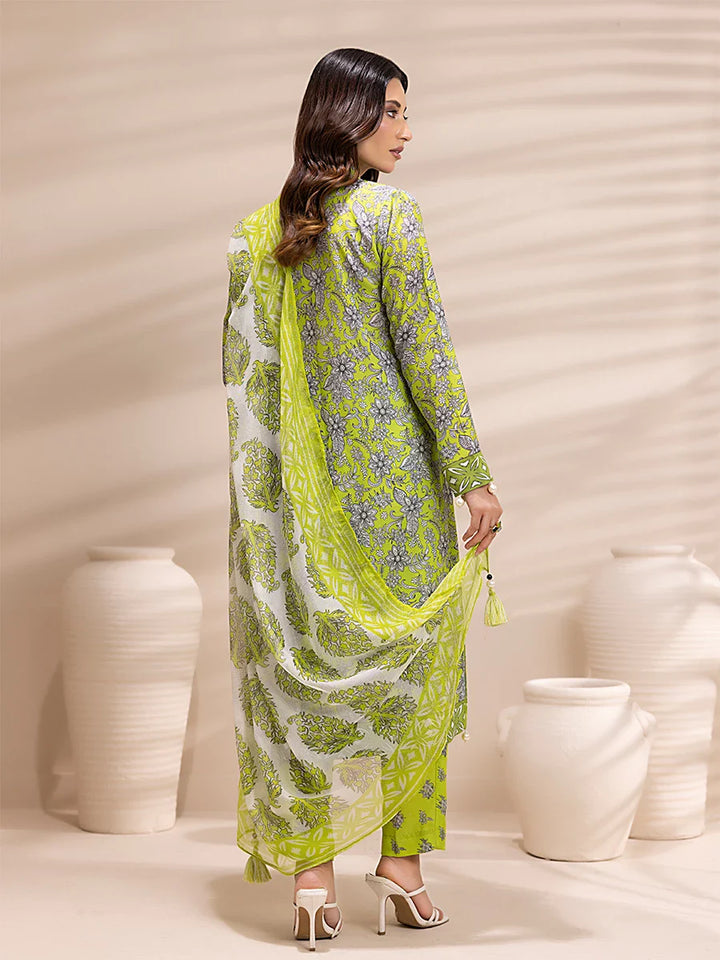 Elegant 3-piece suit in premium printed lawn silk. Includes a breathable shirt, trousers, and a lightweight dupatta. Perfect for any occasion.