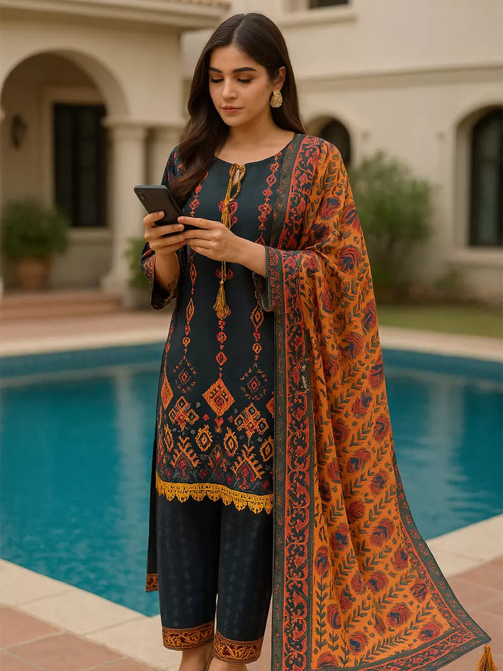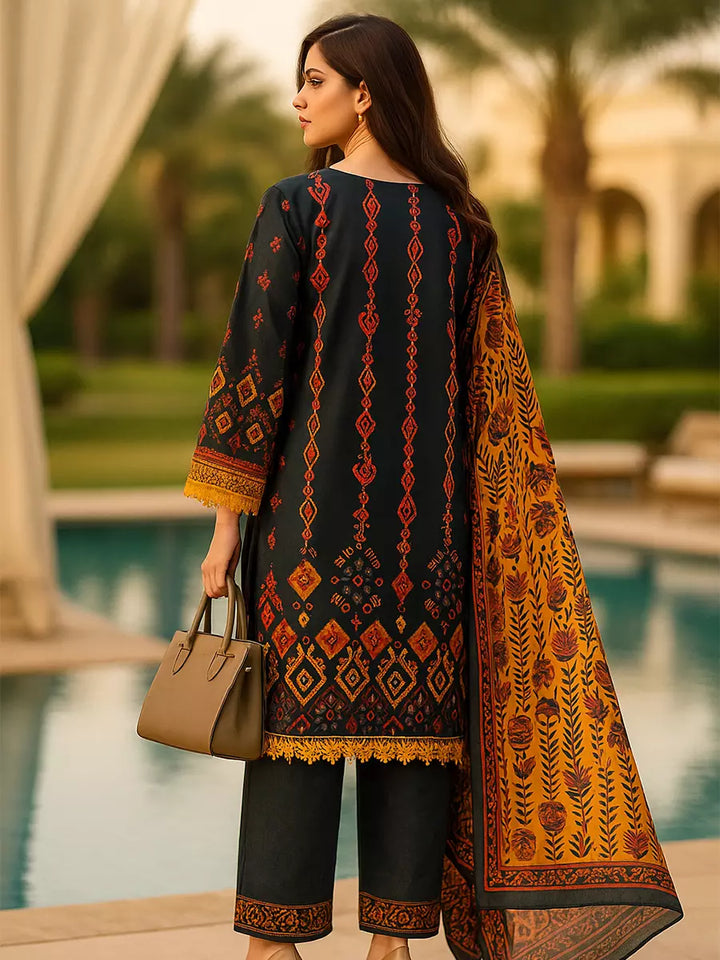Elegant 3-piece suit in premium printed lawn silk. Includes a breathable shirt, trousers, and a lightweight dupatta. Perfect for any occasion.