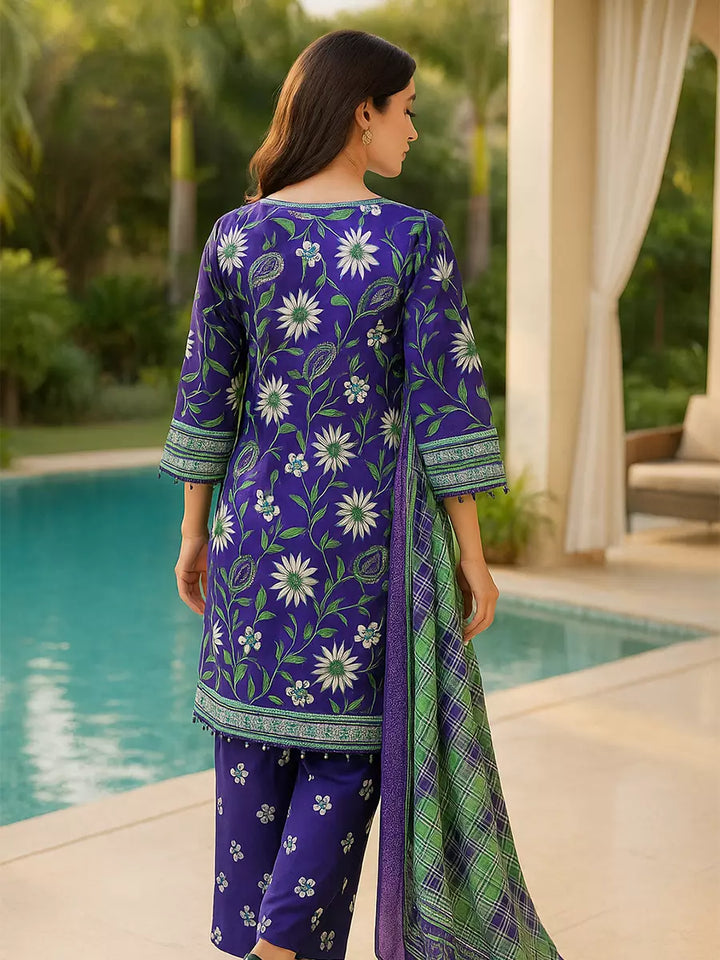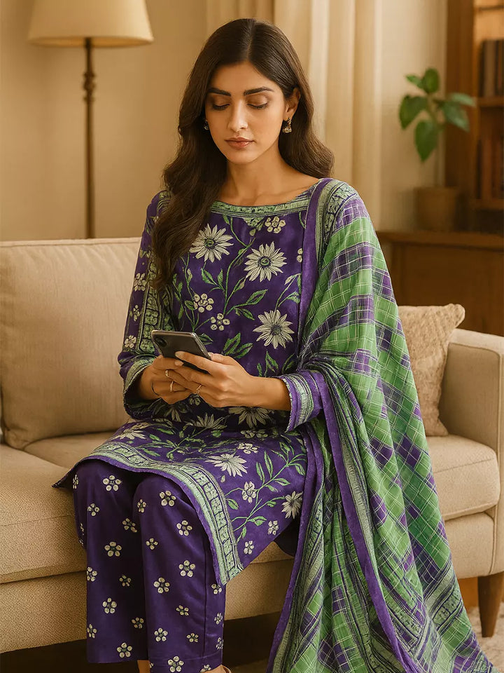 Elegant 3-piece suit in premium printed lawn silk. Includes a breathable shirt, trousers, and a lightweight dupatta. Perfect for any occasion.