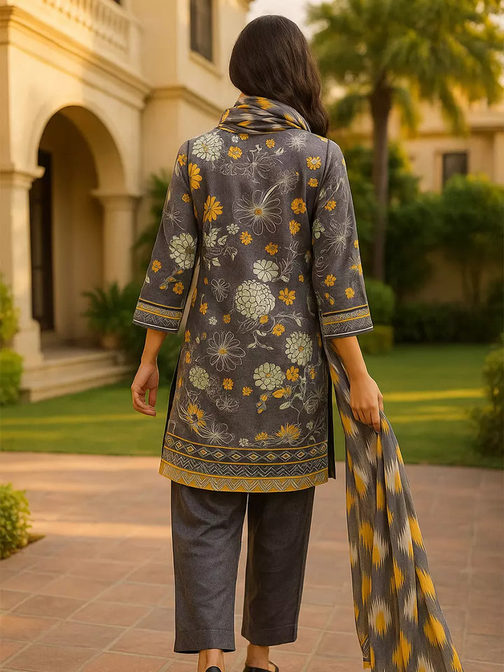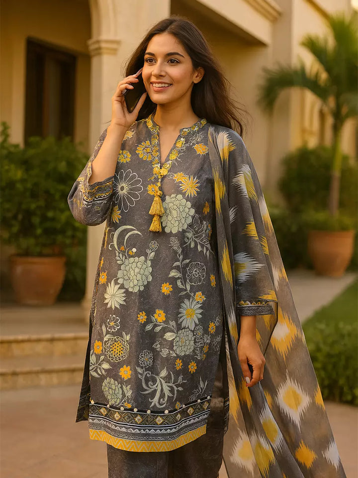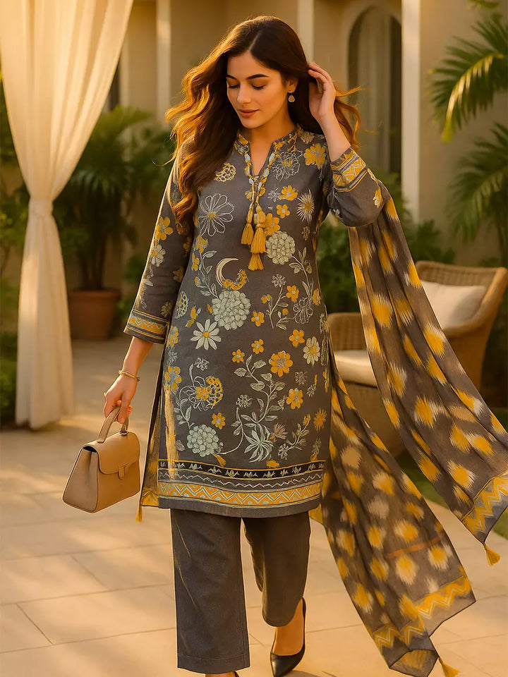 Elegant 3-piece suit in premium printed lawn silk. Includes a breathable shirt, trousers, and a lightweight dupatta. Perfect for any occasion.