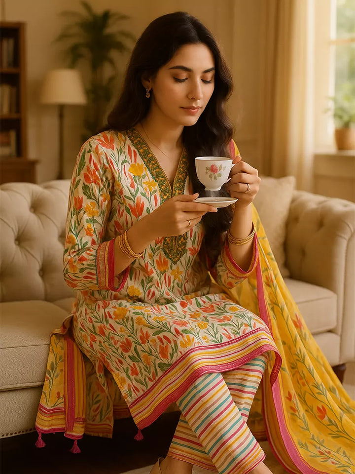 Elegant 3-piece suit in premium printed lawn silk. Includes a breathable shirt, trousers, and a lightweight dupatta. Perfect for any occasion.