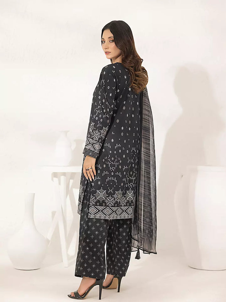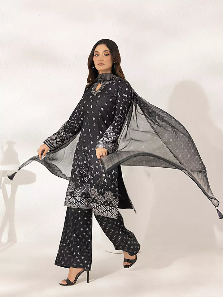 Elegant 3-piece suit in premium printed lawn silk. Includes a breathable shirt, trousers, and a lightweight dupatta. Perfect for daily wear.