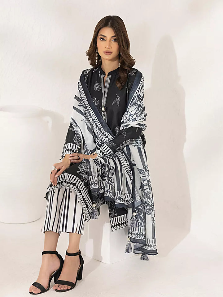Elegant 3-piece suit in premium printed lawn silk. Includes a breathable shirt, trousers, and a lightweight dupatta. Perfect for daily wear.