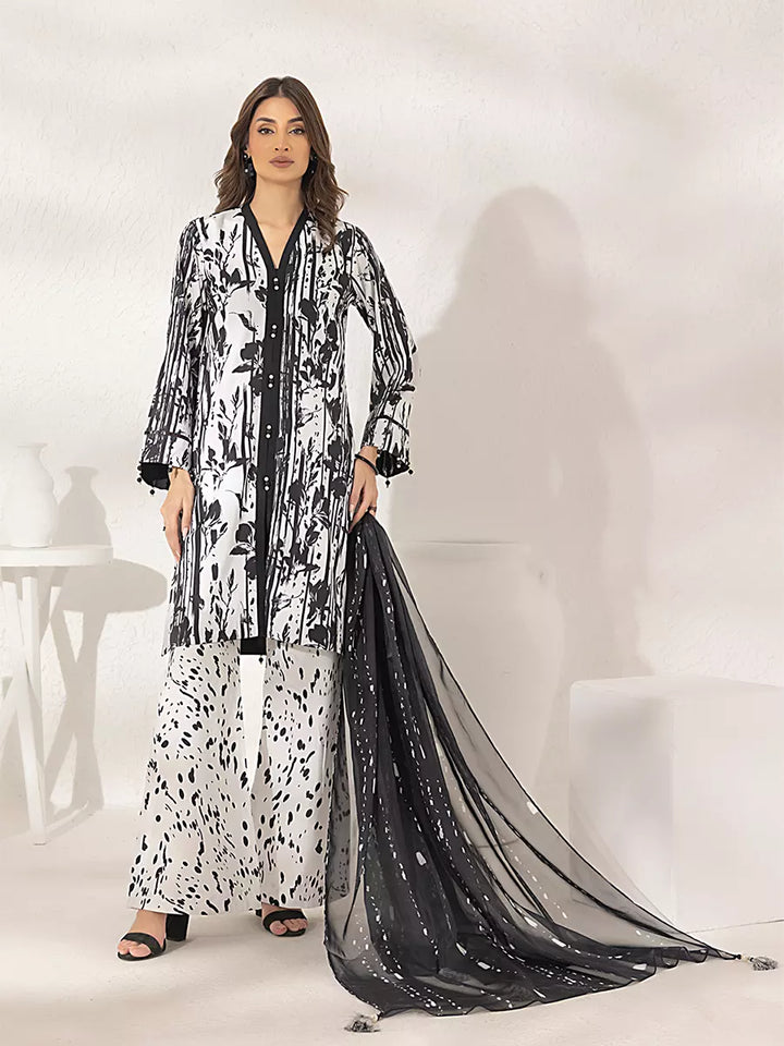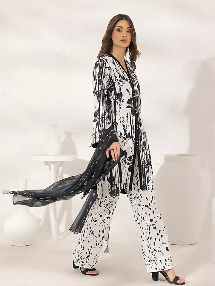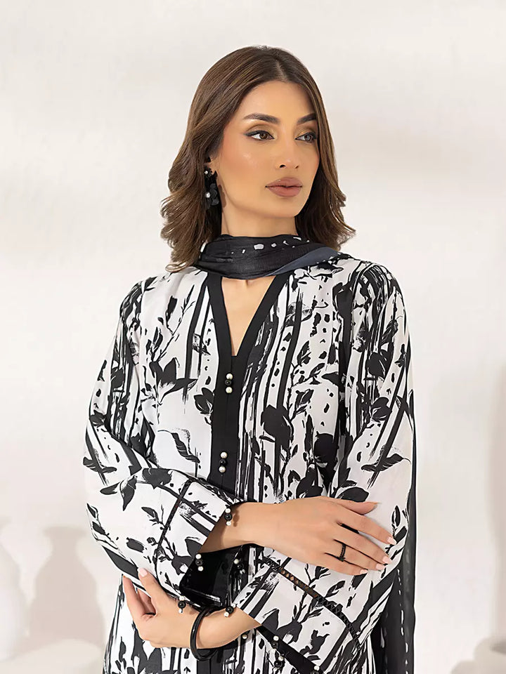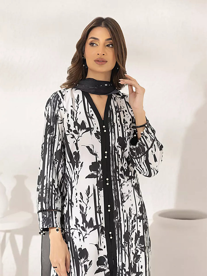Elegant 3-piece suit in premium printed lawn silk. Includes a breathable shirt, trousers, and a lightweight dupatta. Perfect for daily wear.