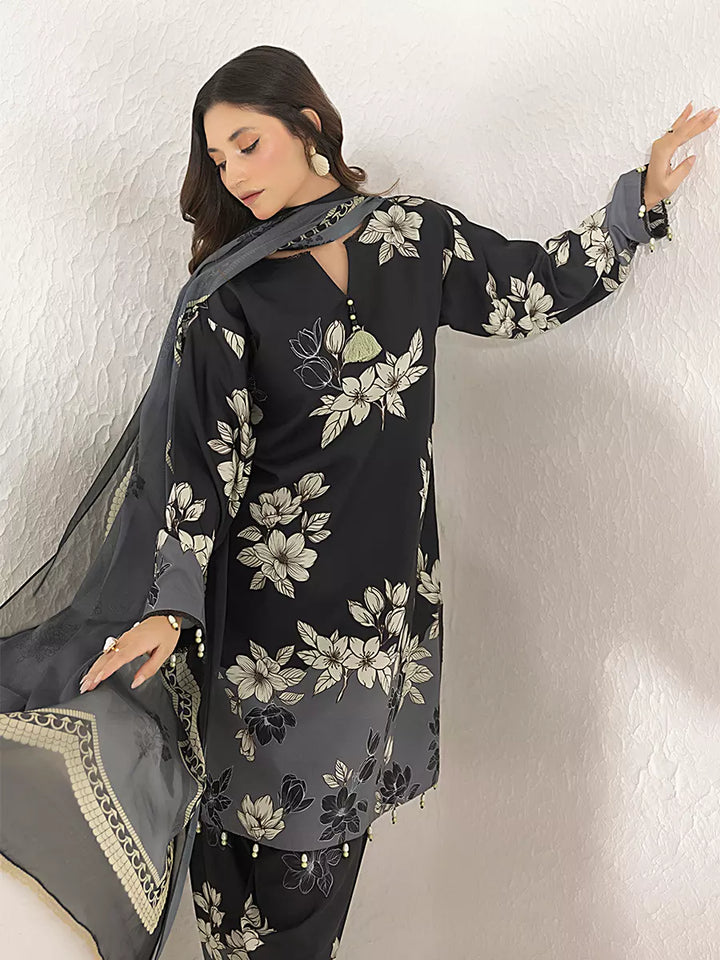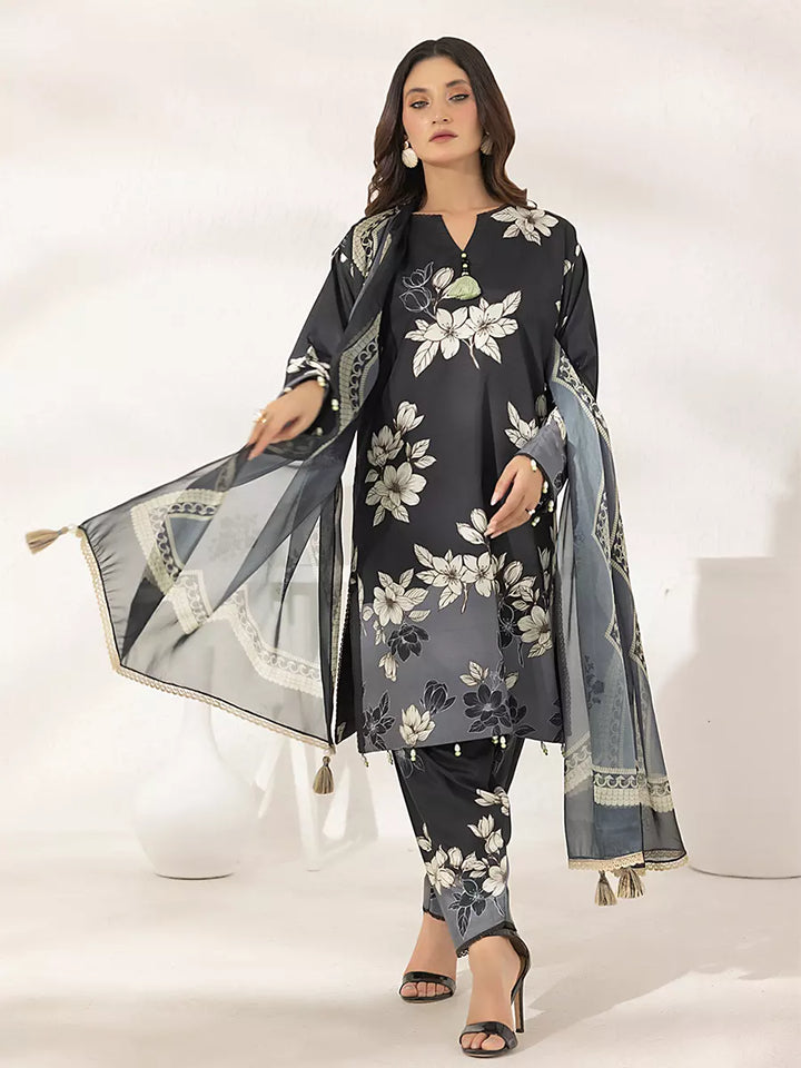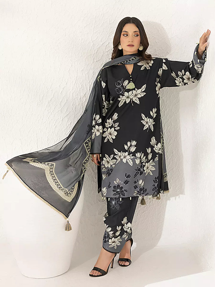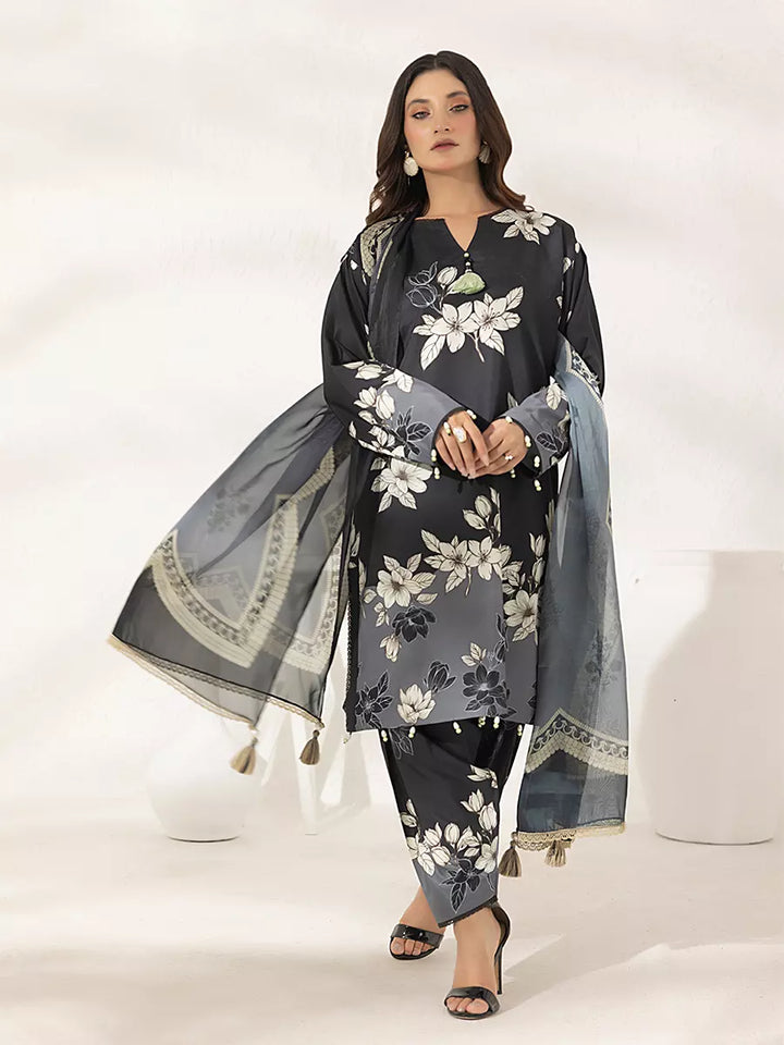 Elegant 3-piece suit in premium printed lawn silk. Includes a breathable shirt, trousers, and a lightweight dupatta. Perfect for daily wear.