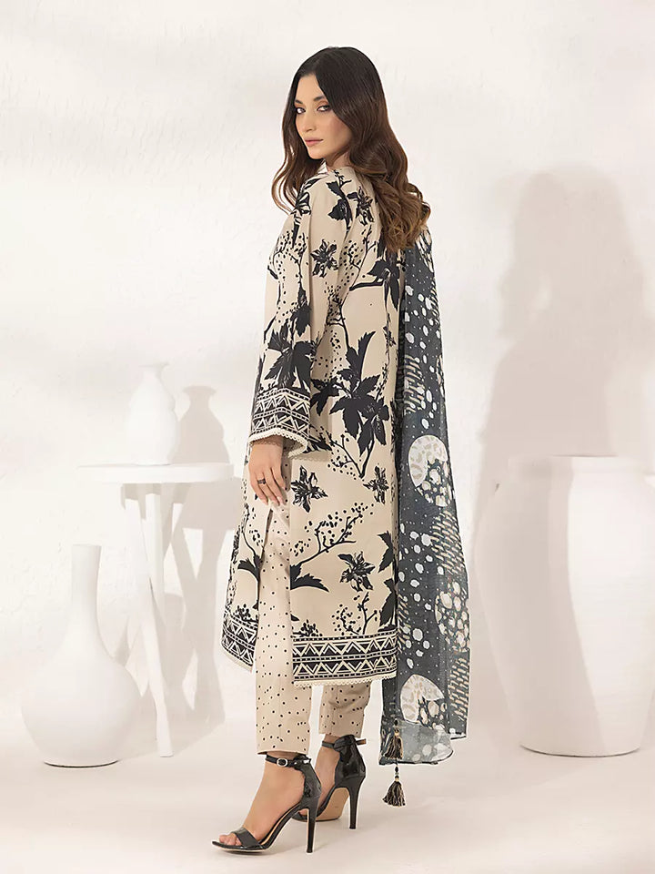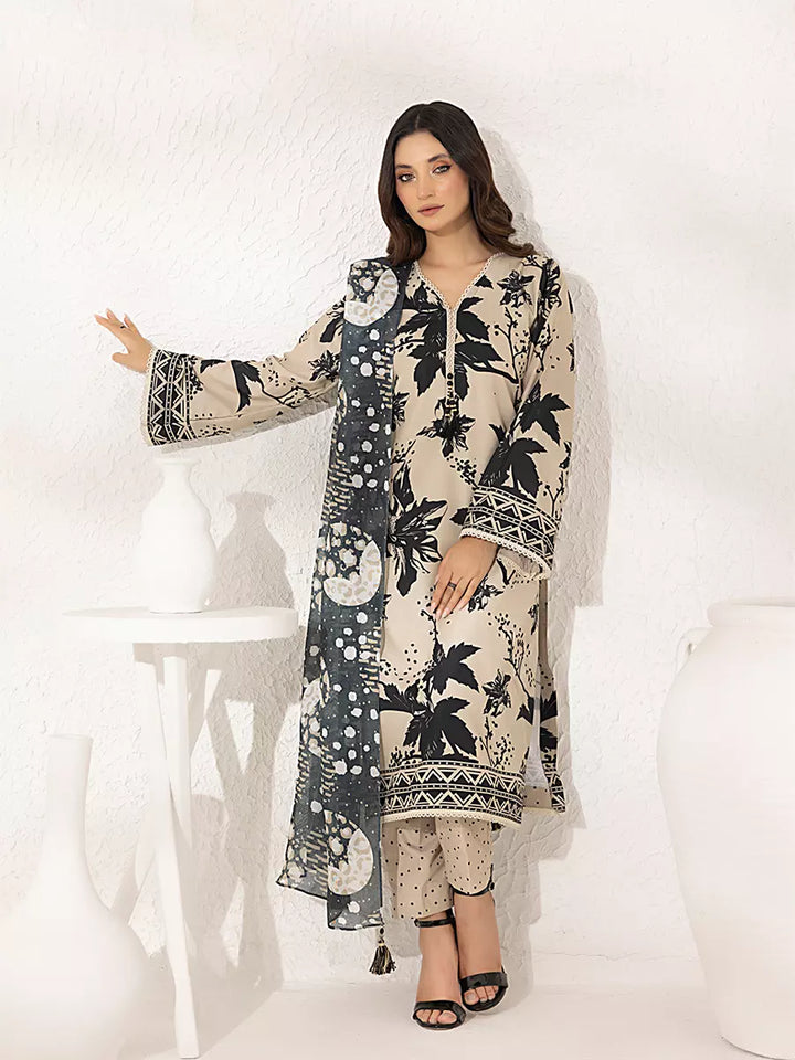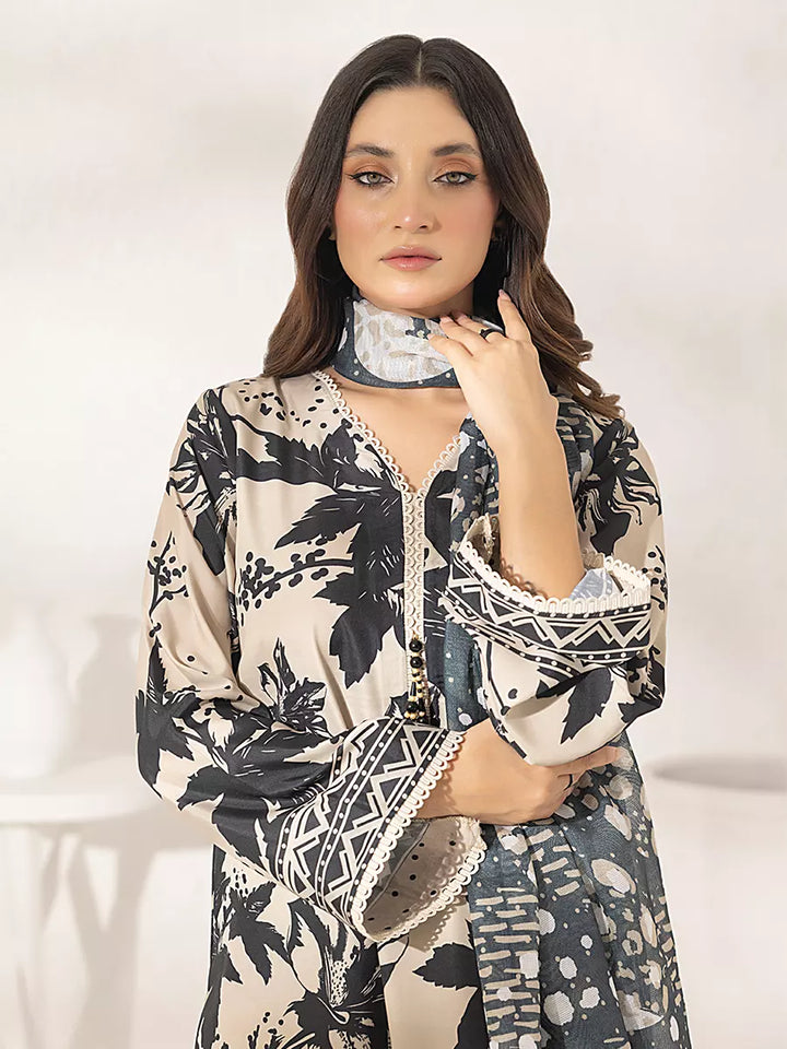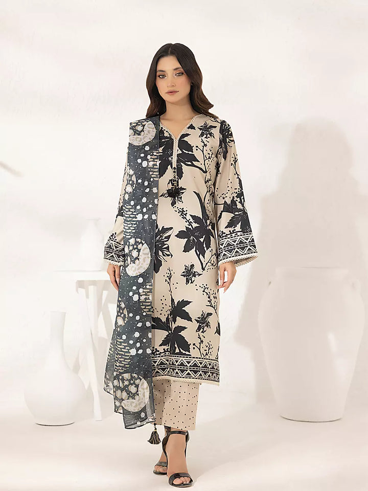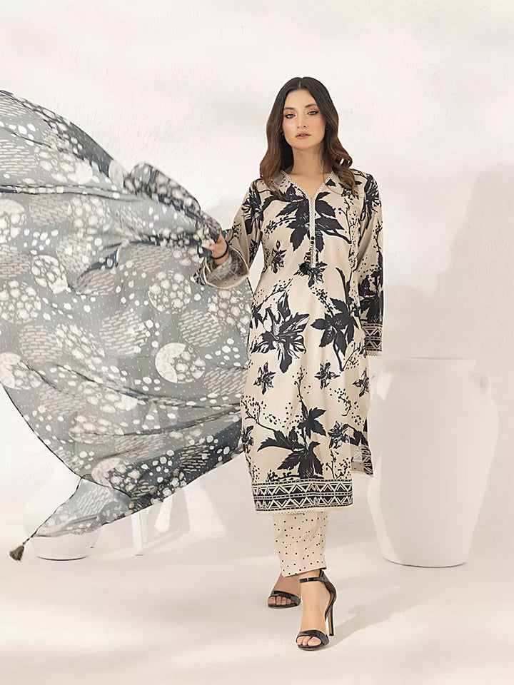Elegant 3-piece suit in premium printed lawn silk. Includes a breathable shirt, trousers, and a lightweight dupatta. Perfect for daily wear.