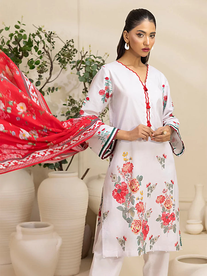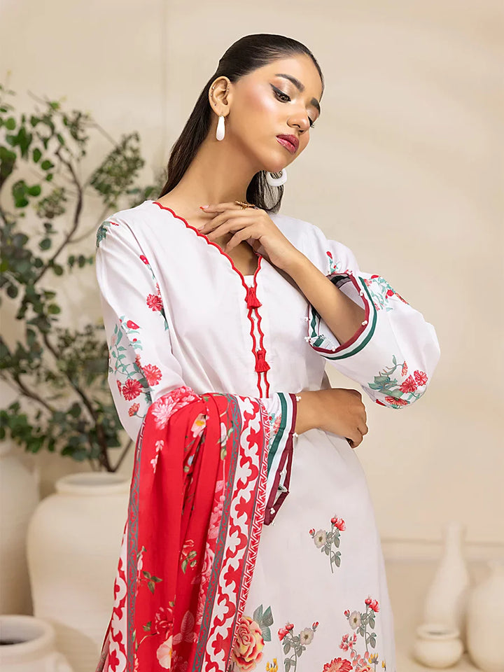 Brighten up your wardrobe with our 3-Piece Unstitched Lawn Collection. Featuring a vibrant printed shirt, cambric dyed trouser, and a beautifully printed dupatta.