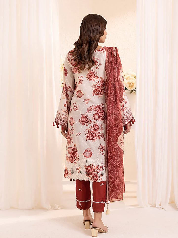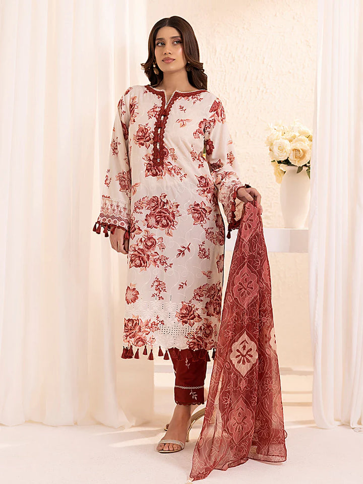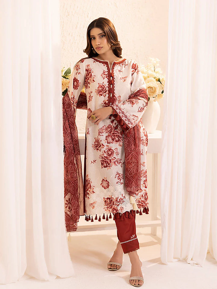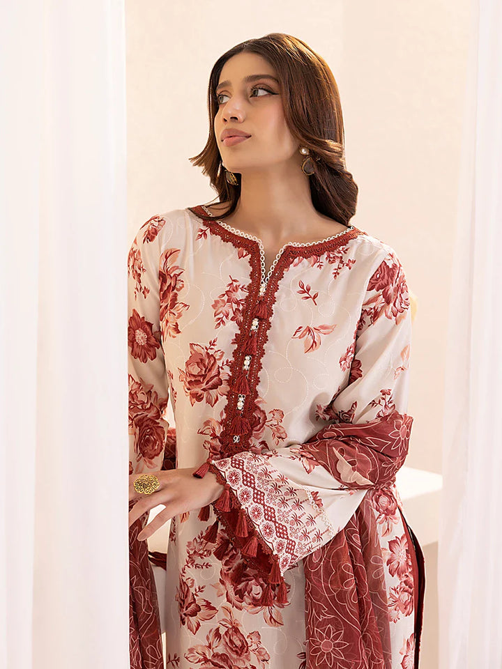 Experience elegance with our 3-piece Silk Lawn Embroidered Suit. Featuring a printed embroidered chiffon dupatta, silk lawn trousers, and a stunning embroidered shirt.