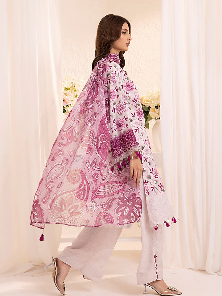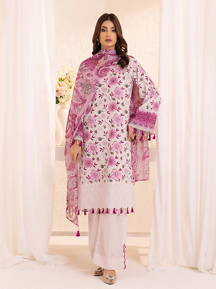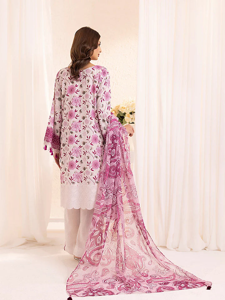 Experience elegance with our 3-piece Silk Lawn Embroidered Suit. Featuring a printed embroidered chiffon dupatta, silk lawn trousers, and a stunning embroidered shirt.