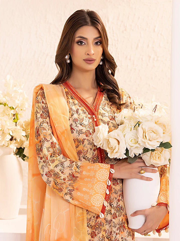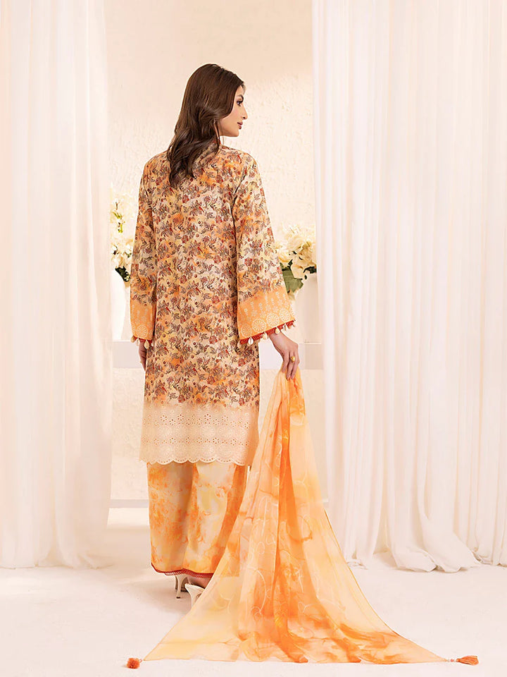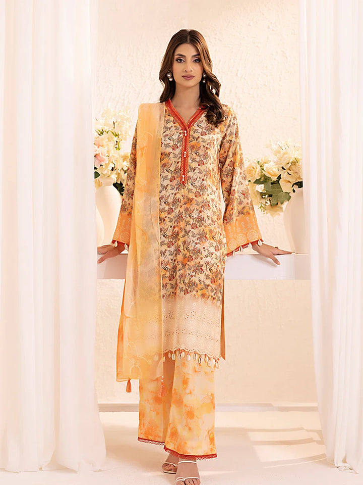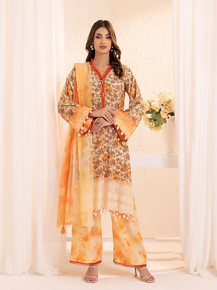 Experience elegance with our 3-piece Silk Lawn Embroidered Suit. Featuring a printed embroidered chiffon dupatta, silk lawn trousers, and a stunning embroidered shirt.