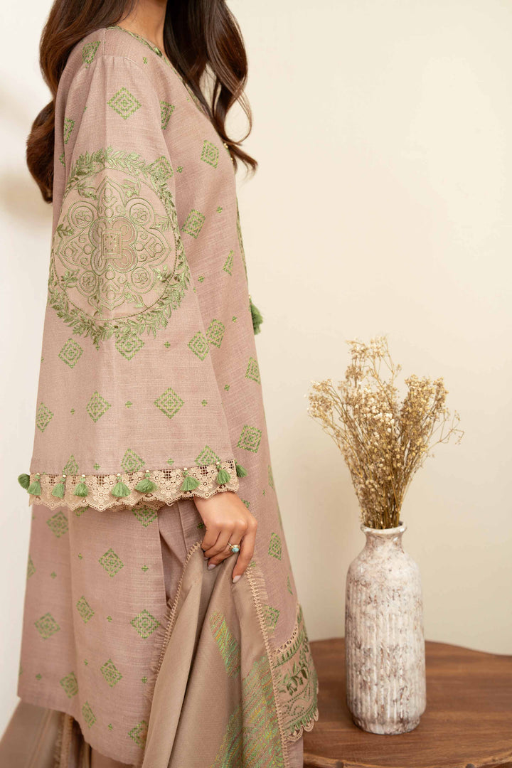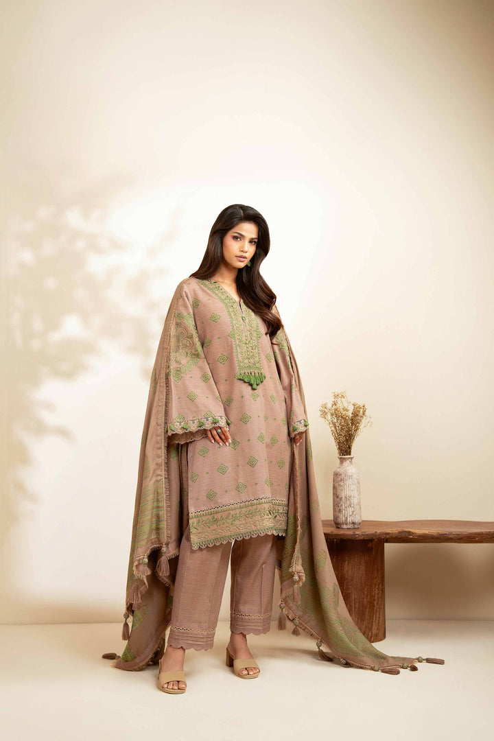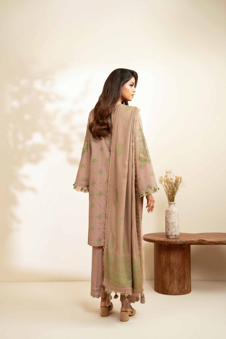 Wearable culture, crafted for comfort with this printed embroidered three-piece from the latest unstitched Winter Collection.