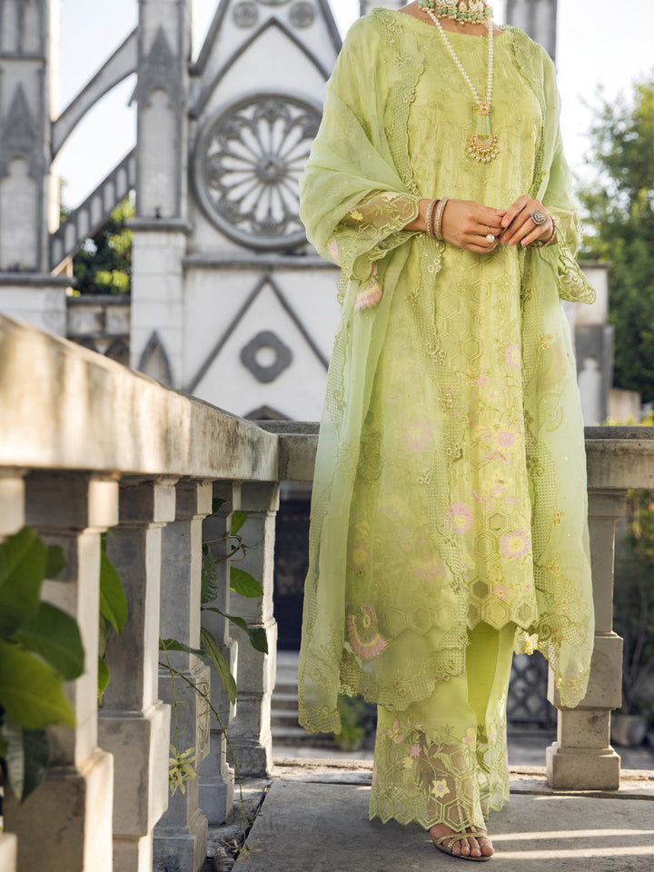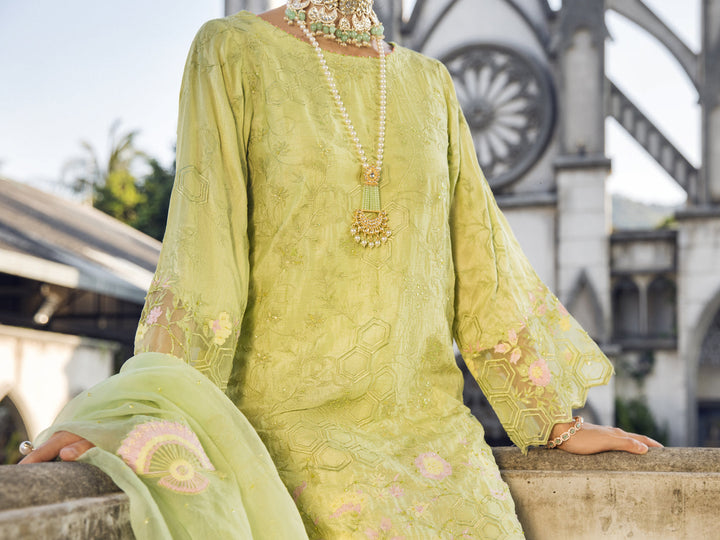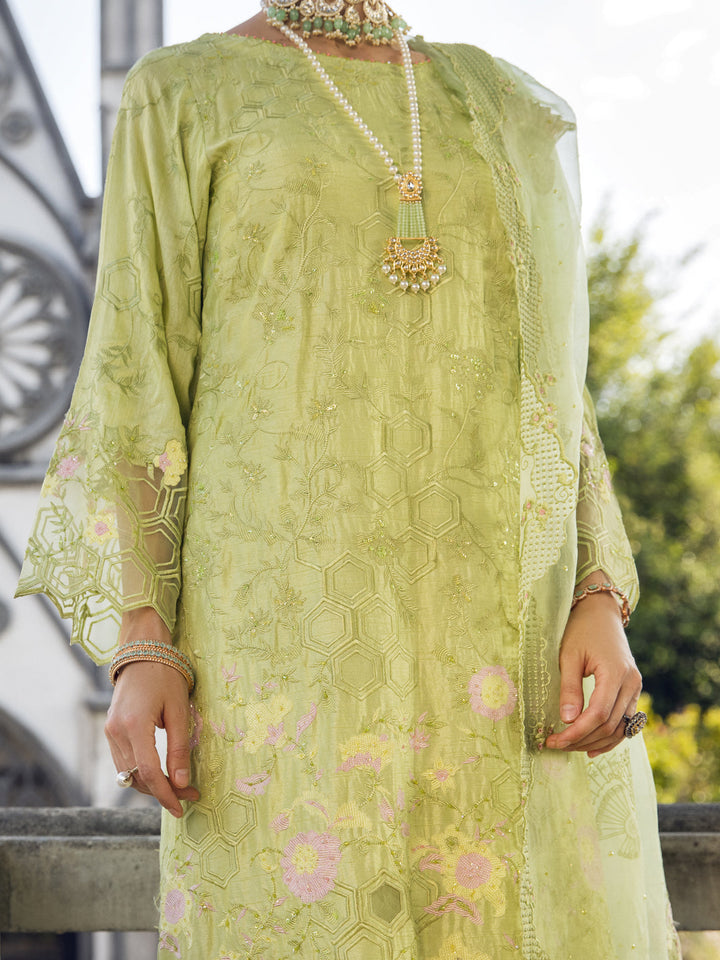 Fully Embroidered Raw Silk Shirt With Boat Neck and Cut Work on Daman Paired With Straight Pants and Organza Dupatta.