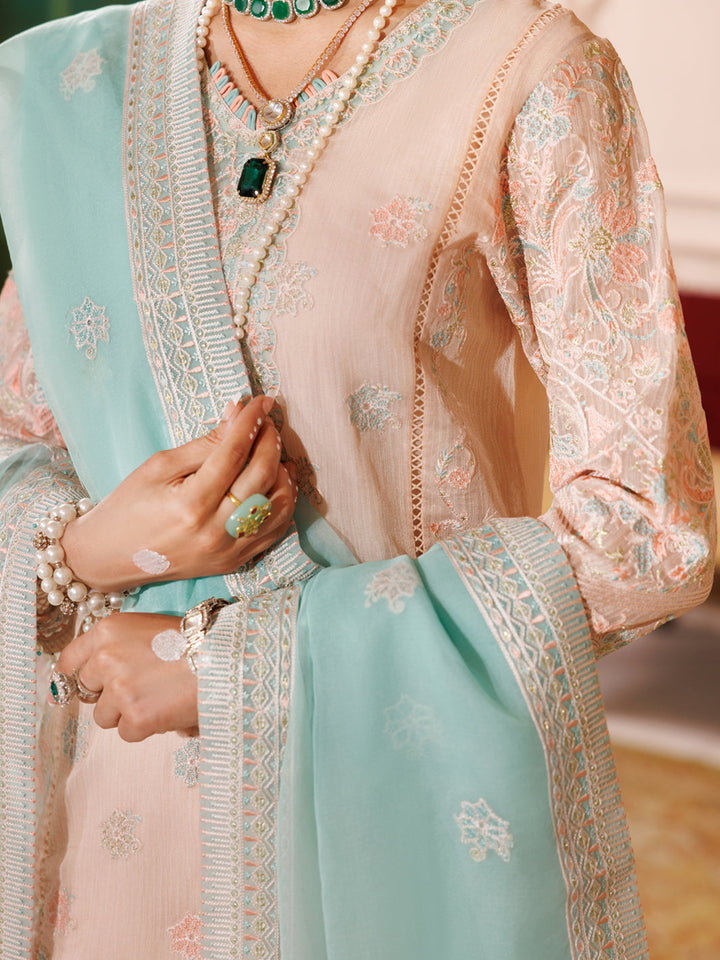 Paneled embroidered slub net shirt beautify with fabric manipulation on daman and sleeves paired with raw silk pants and contrasting slub net dupatta with embroidered borders.