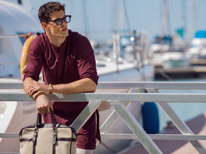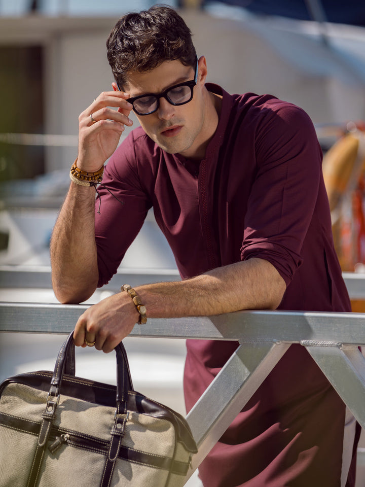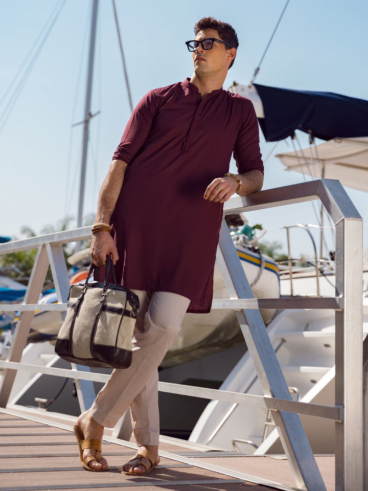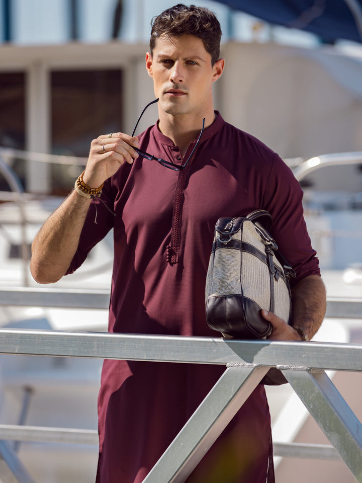 Embroidered Placket On Maroon Kurta With Fabric Button Details