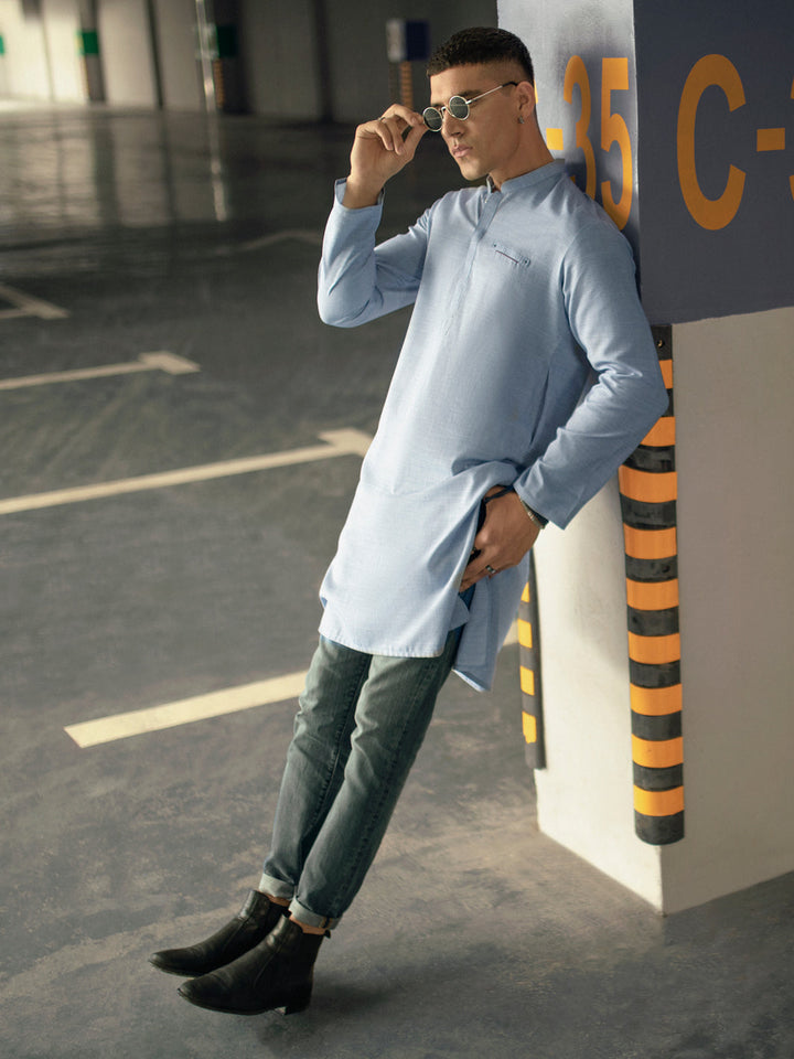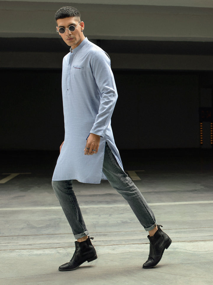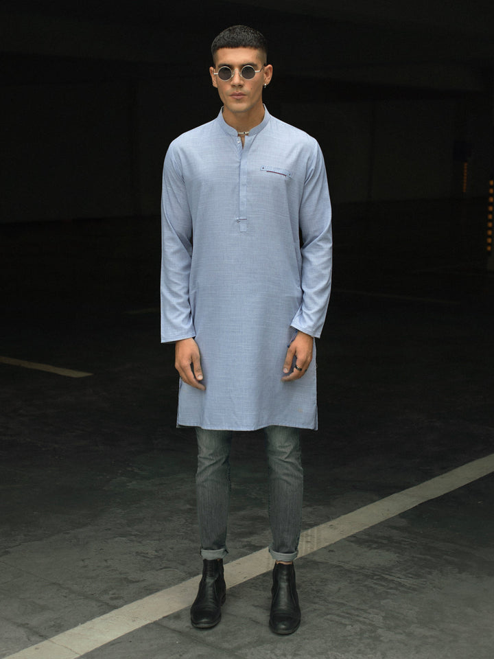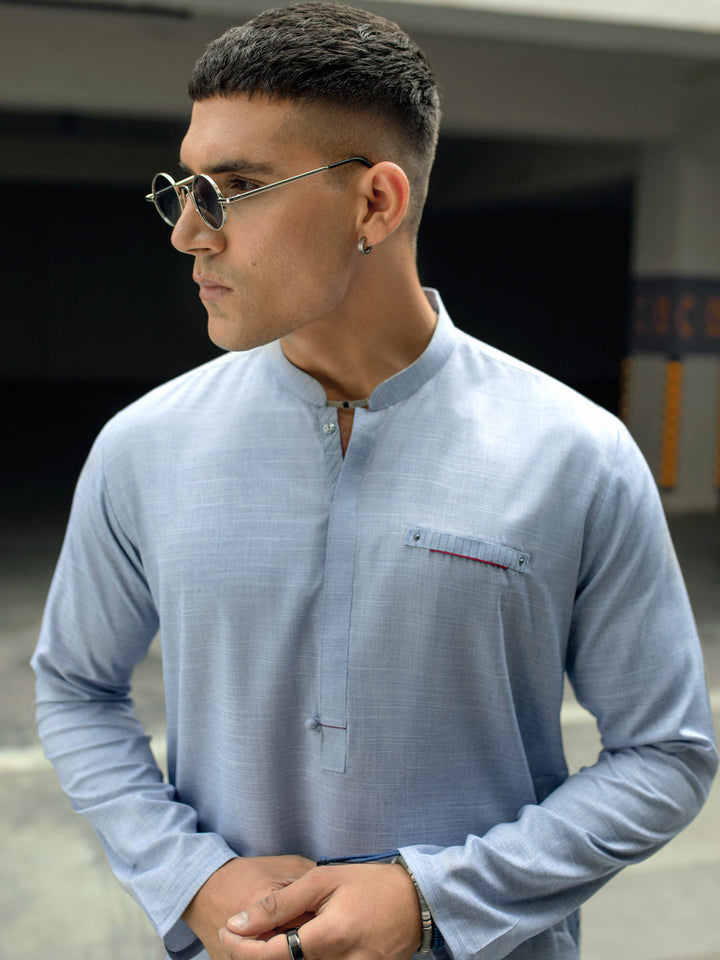 Light Blue Kurta With Cut and Sew Detail on Front Pocket Side and on Placket and Inner Side of Placket
