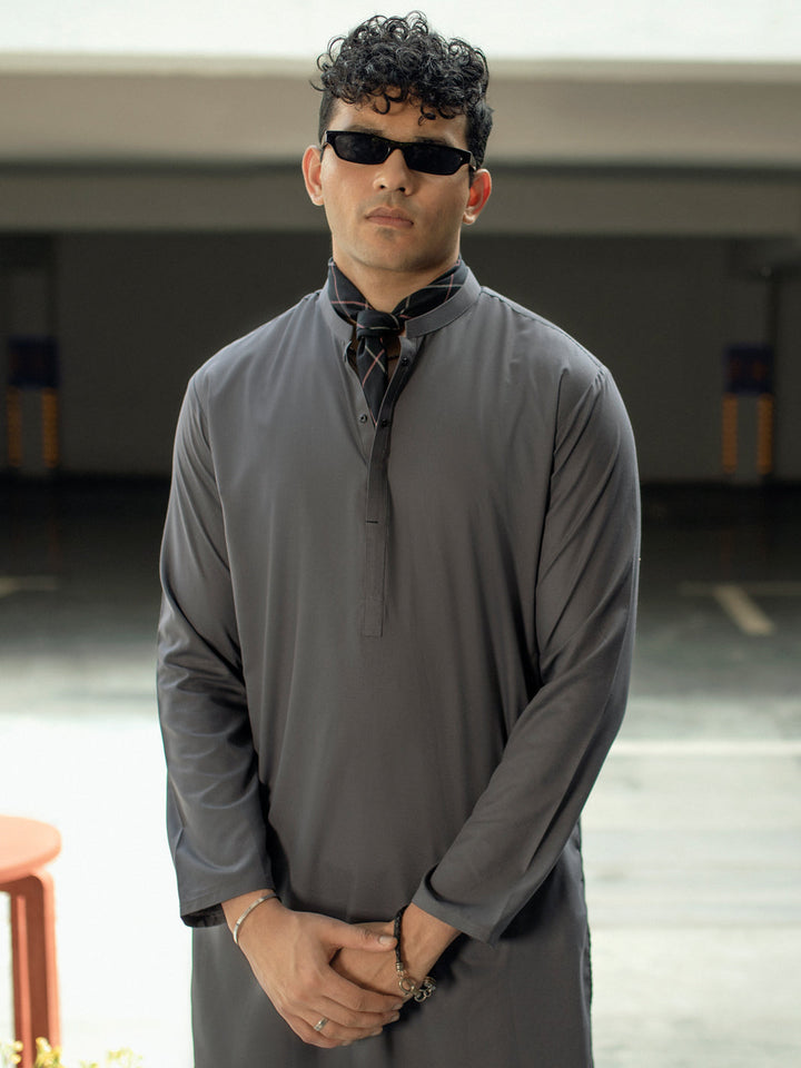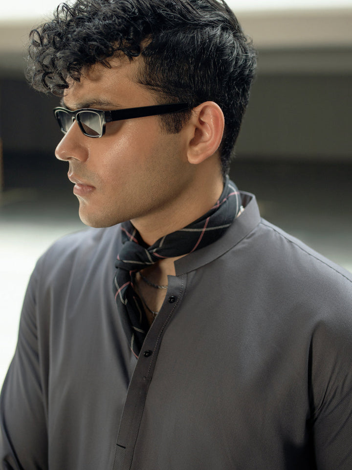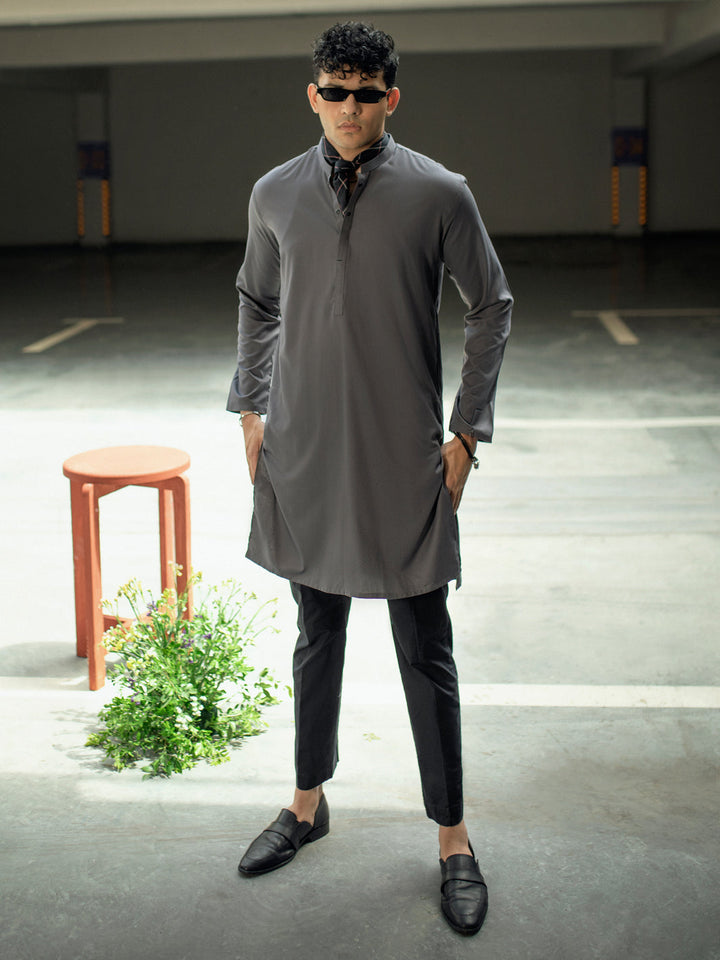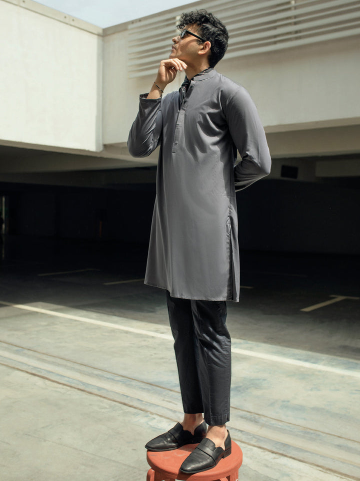 Grey Kurta With Cut and Sew Detail on Front Placket