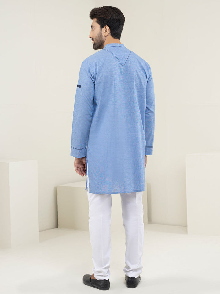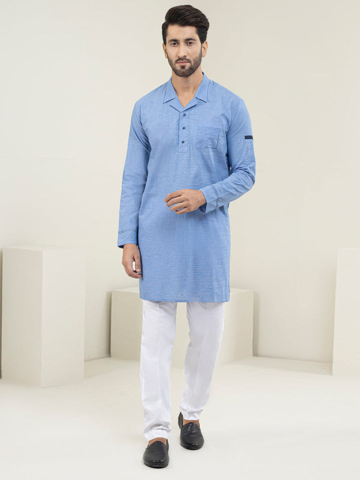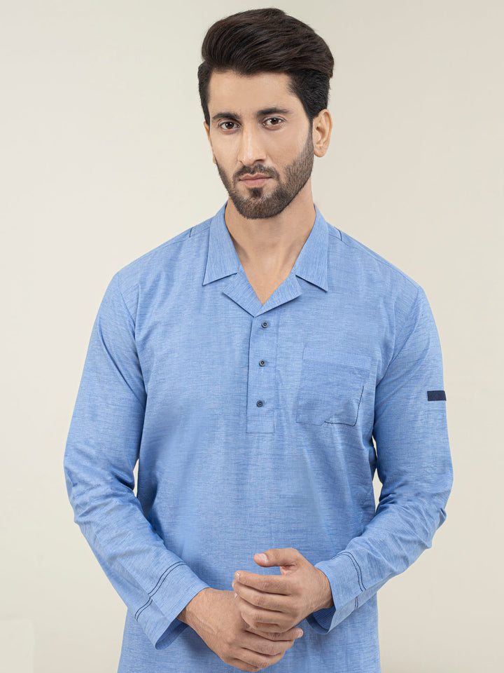 Modern Fit Kurta With Front Pocket, Open Front Collar Wide Button Placket With Wooden Buttons