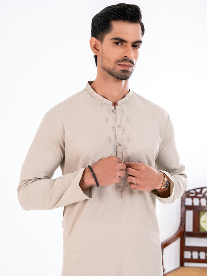 Semi Formal Kurta Adorned With Subtle Embroidered Motifs Around The Placket And Collar