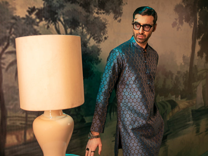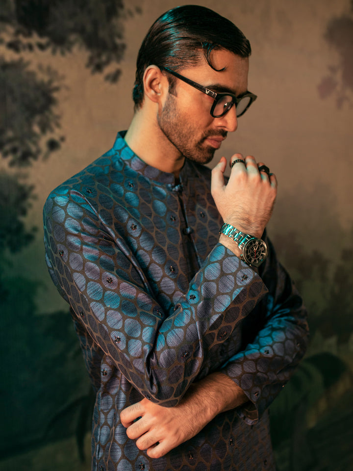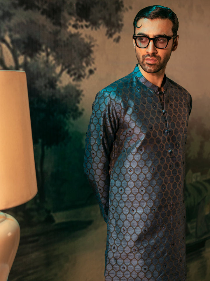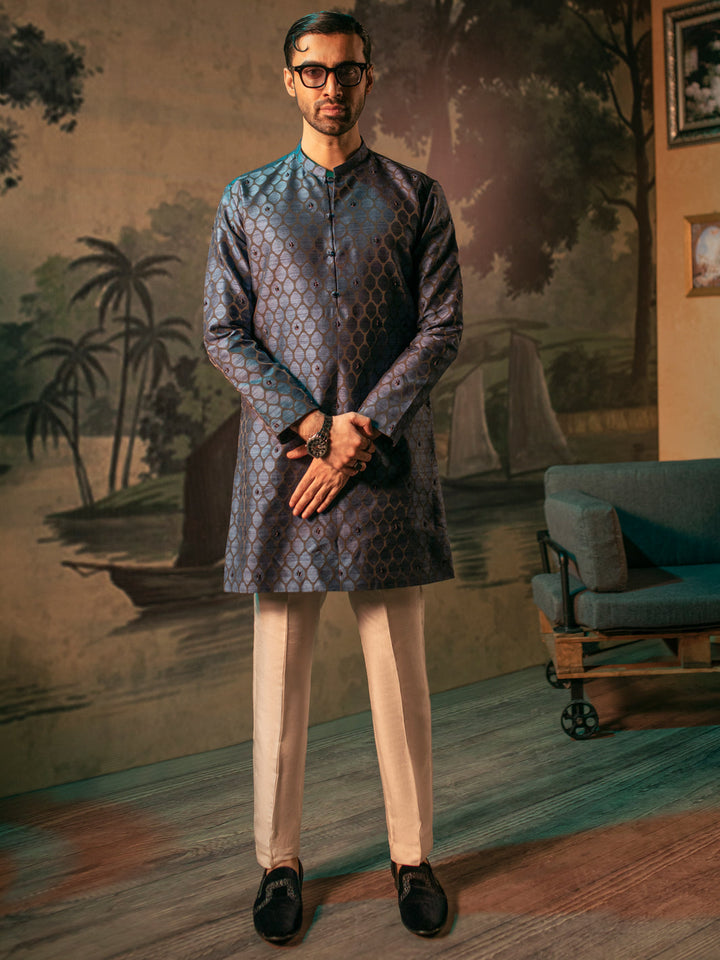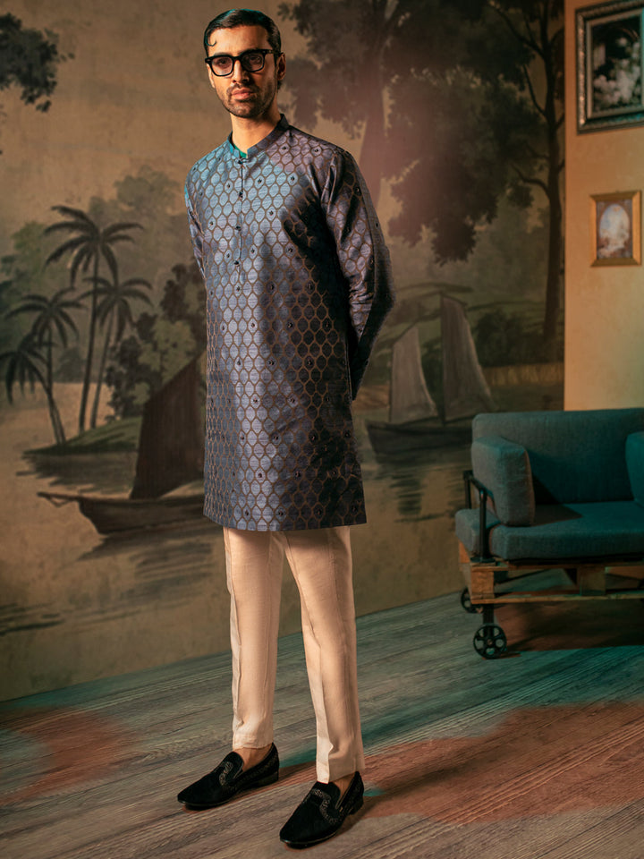 Jacquard Fabric Formal Kurta With Embroidery And Fabric Loop Buttons