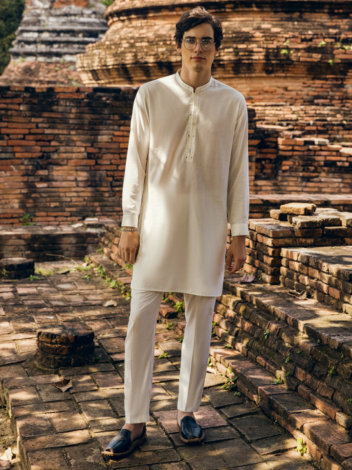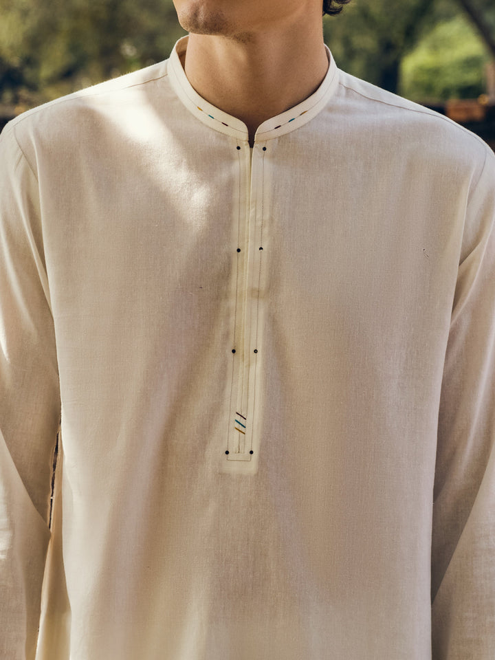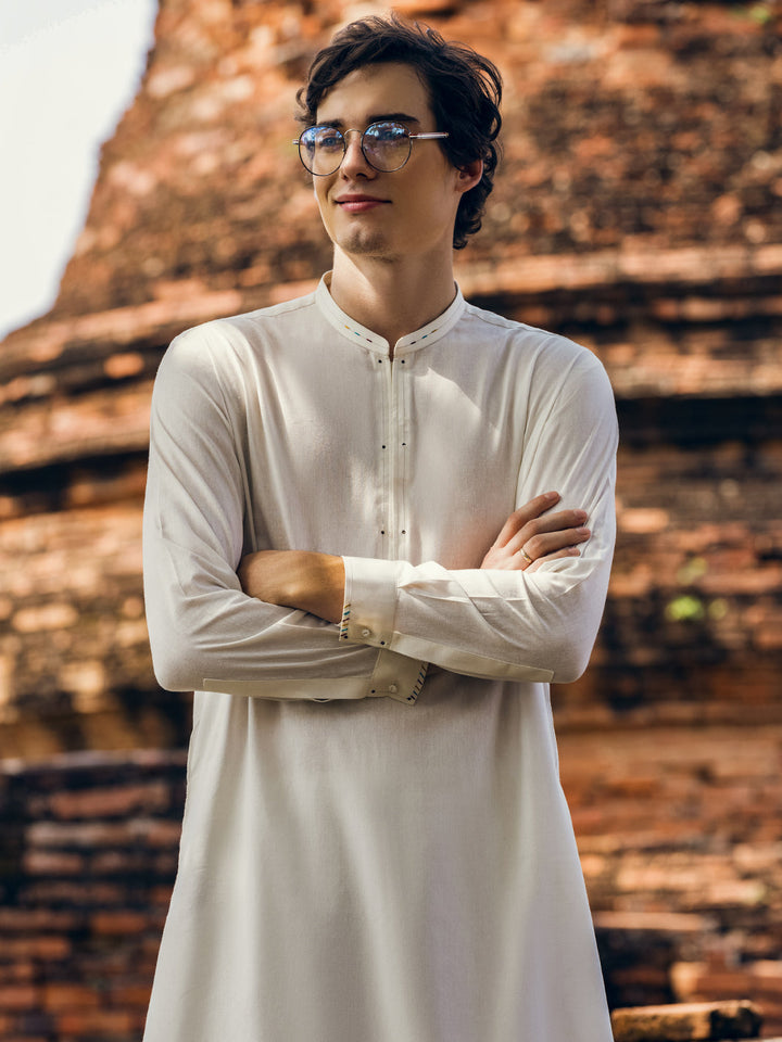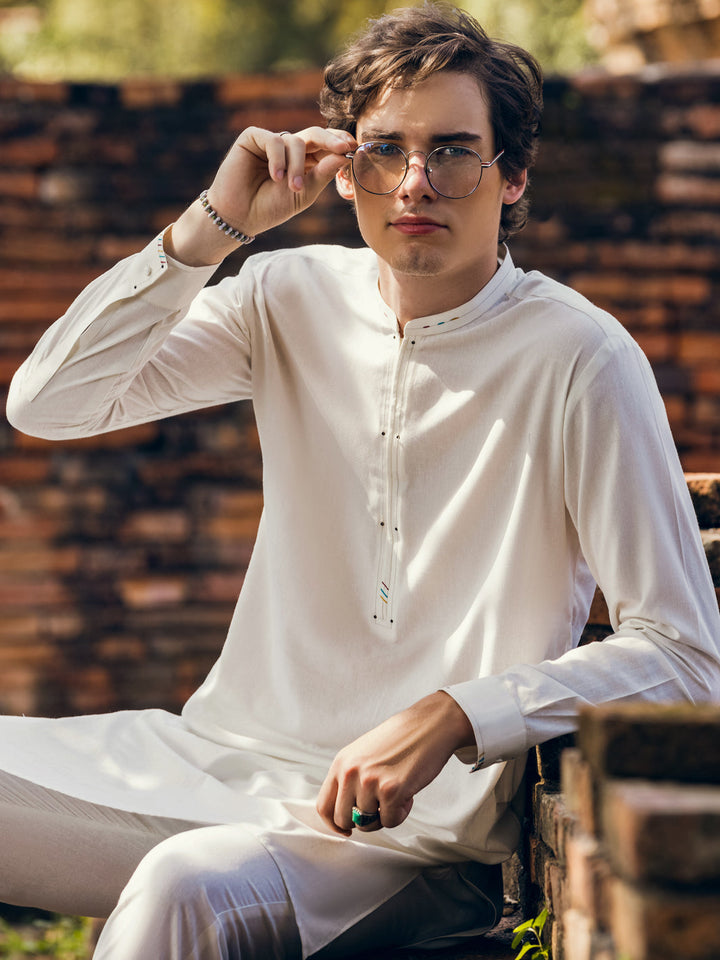 Off White Kurta Trouser Stitched With Slit Collar, Colorful Stitch and Rivet Details