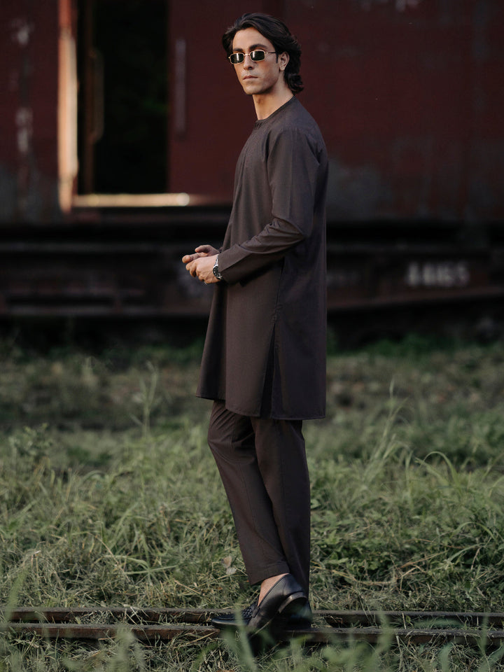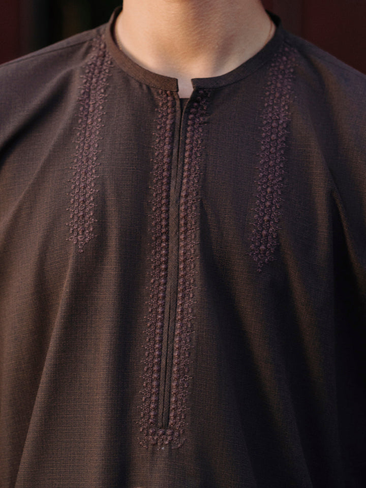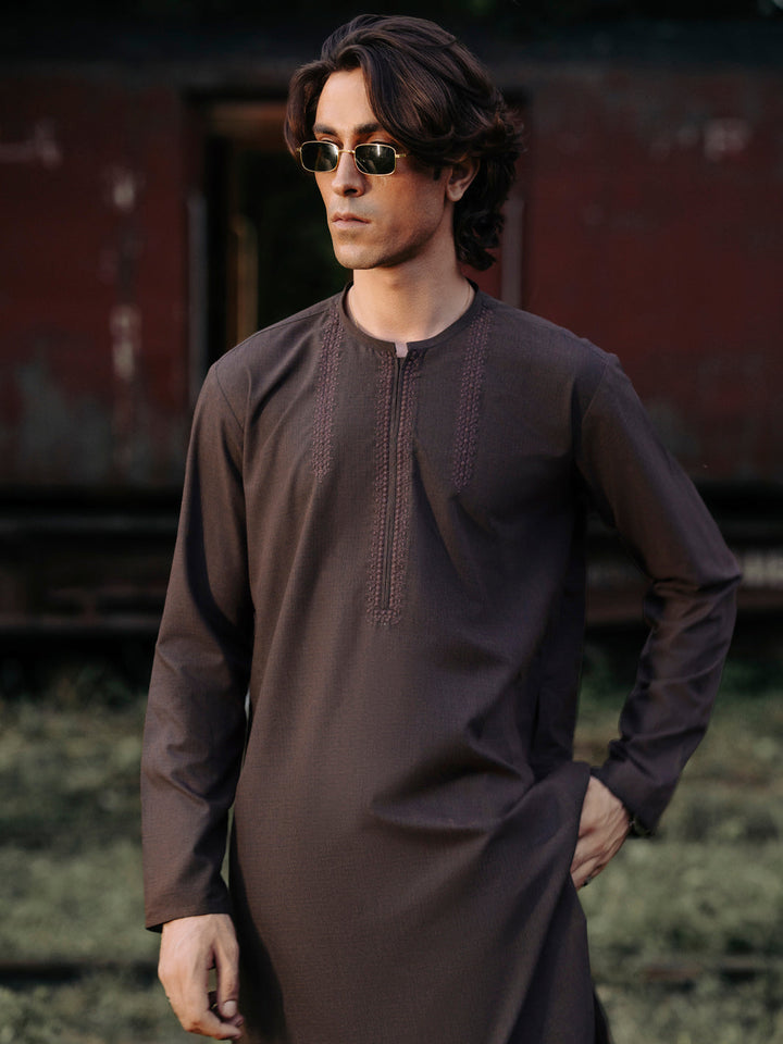Semi-Formal Kurta Trouser Set Featuring Intricate Embroidery on the Front and Around the Placket