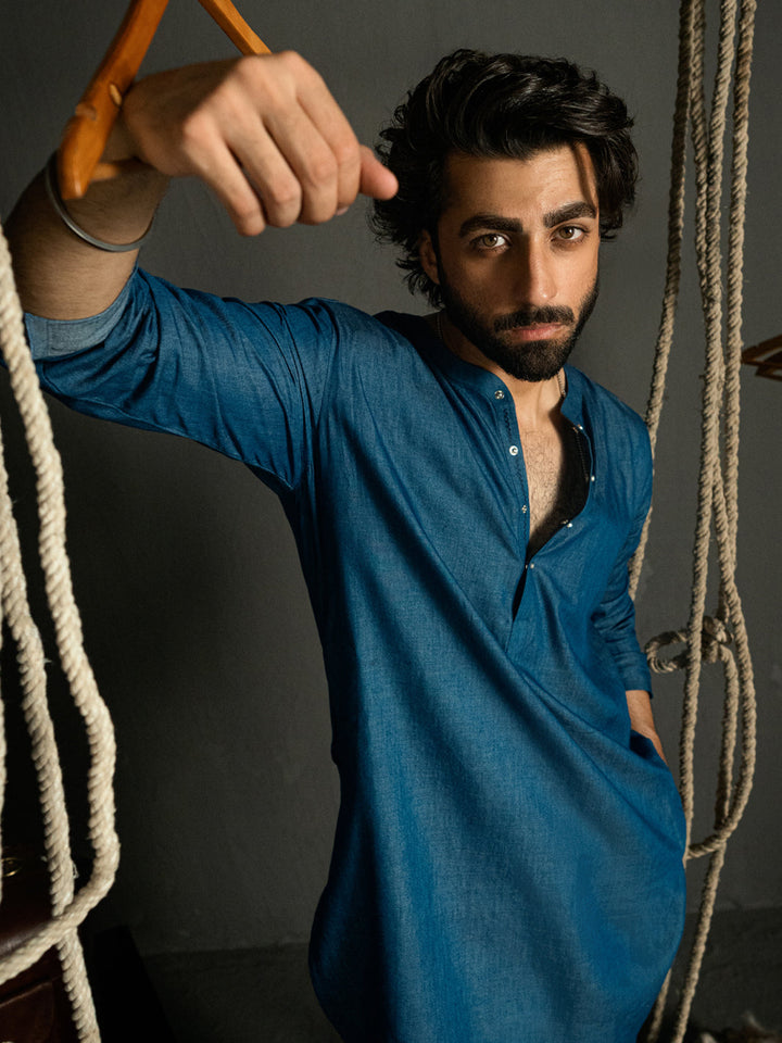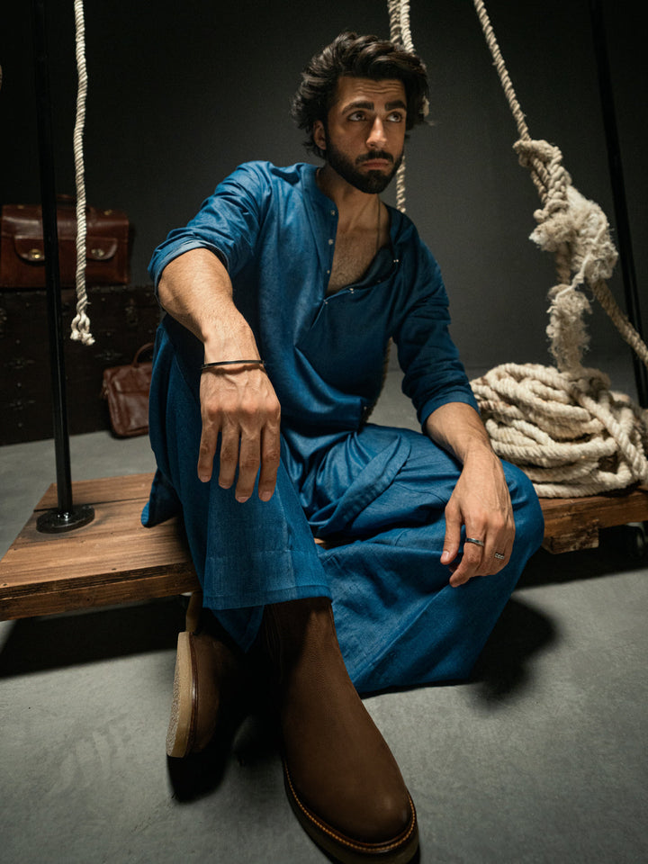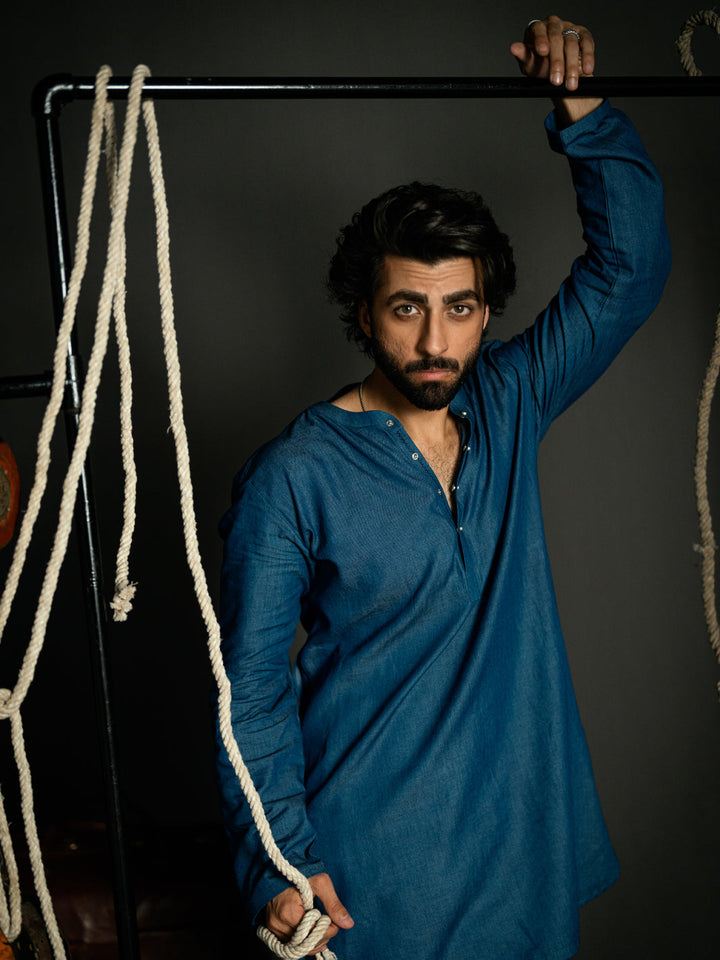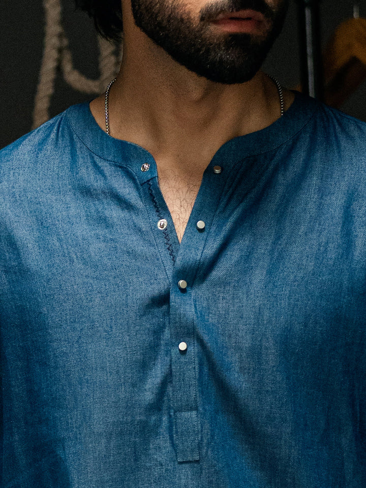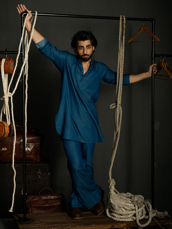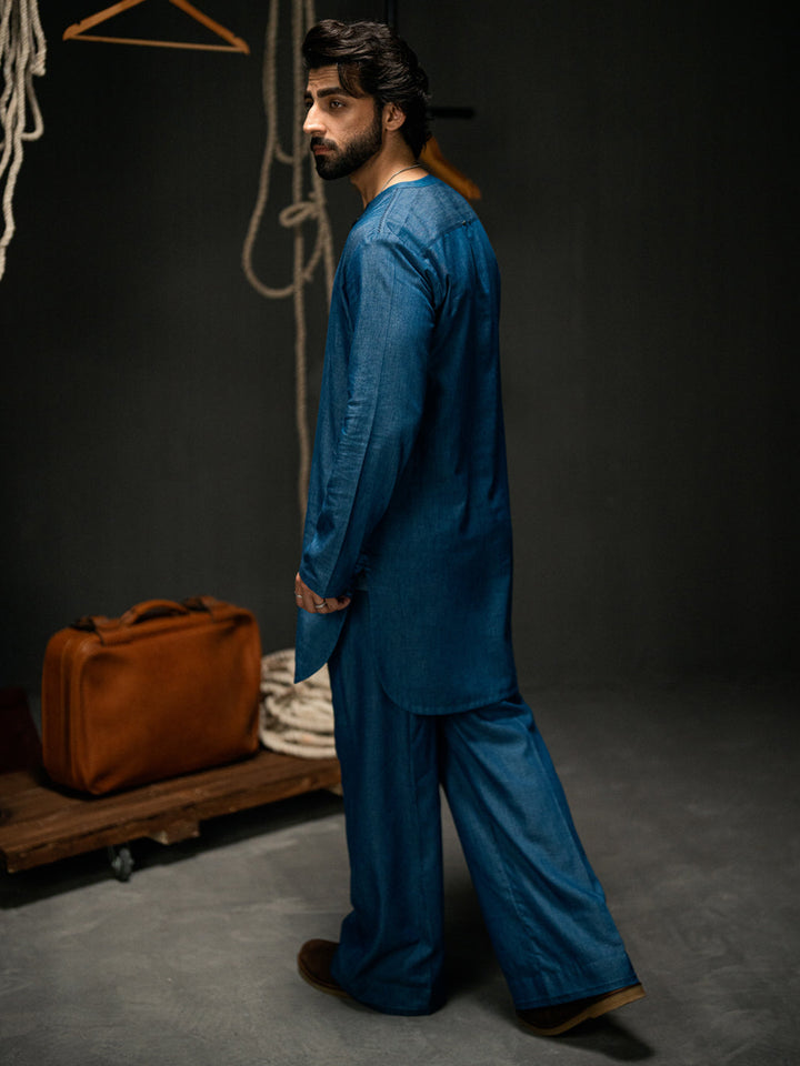 Relaxed Fit Denim Kurta Trousers Styled With Band Collar, Metallic Four-Part Buttons And Subtle Cut & Sew Details