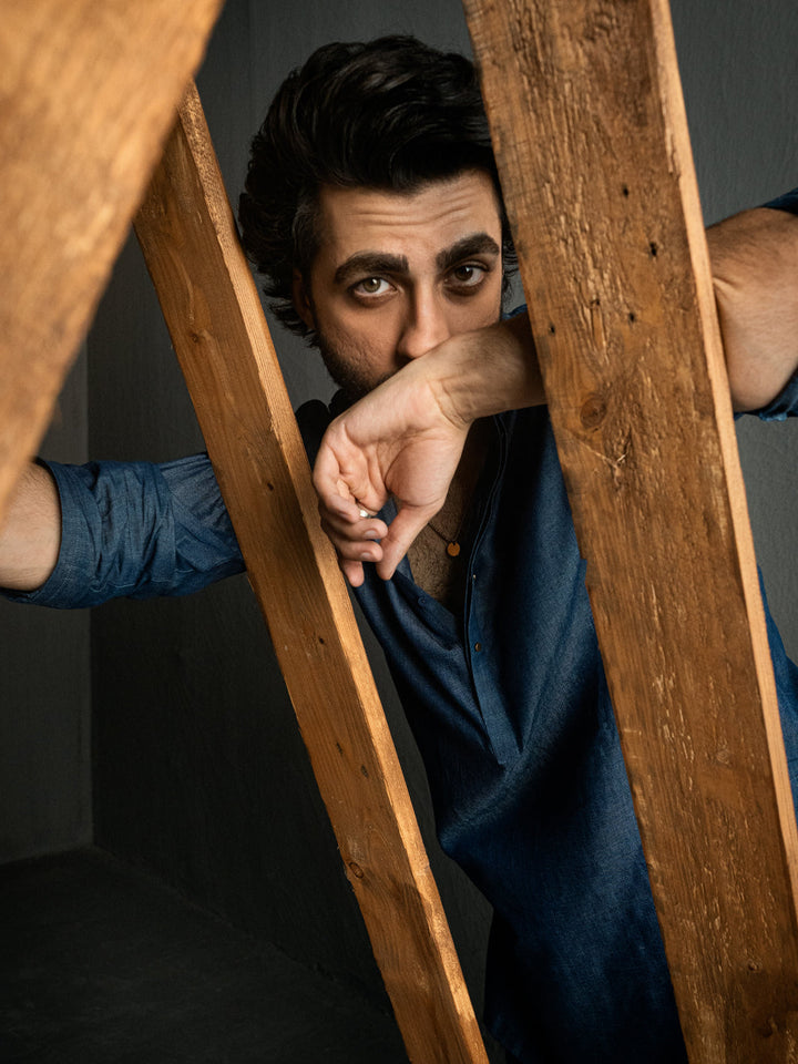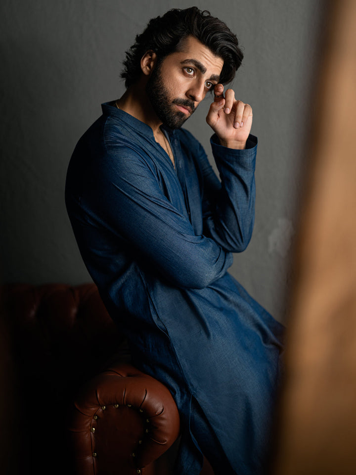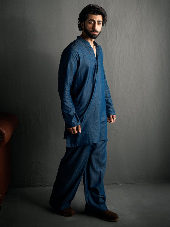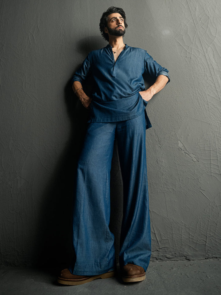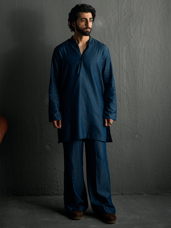 Relaxed Fit Denim Kurta Trousers Styled With Band Collar, Metallic Four-Part Buttons And Subtle Cut & Sew Details