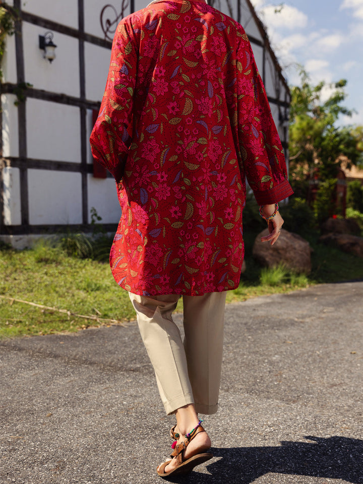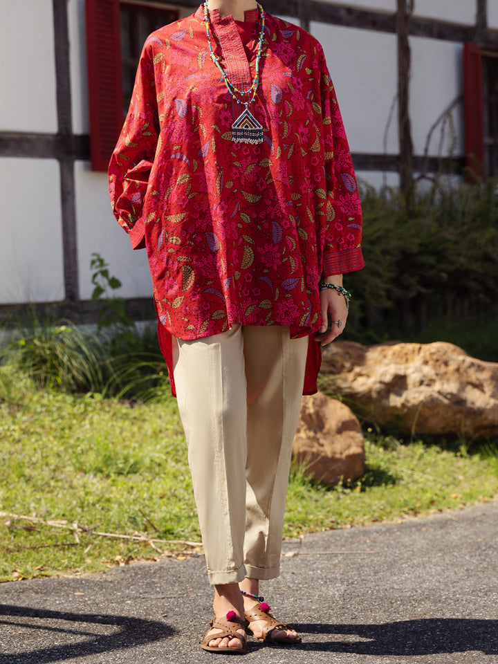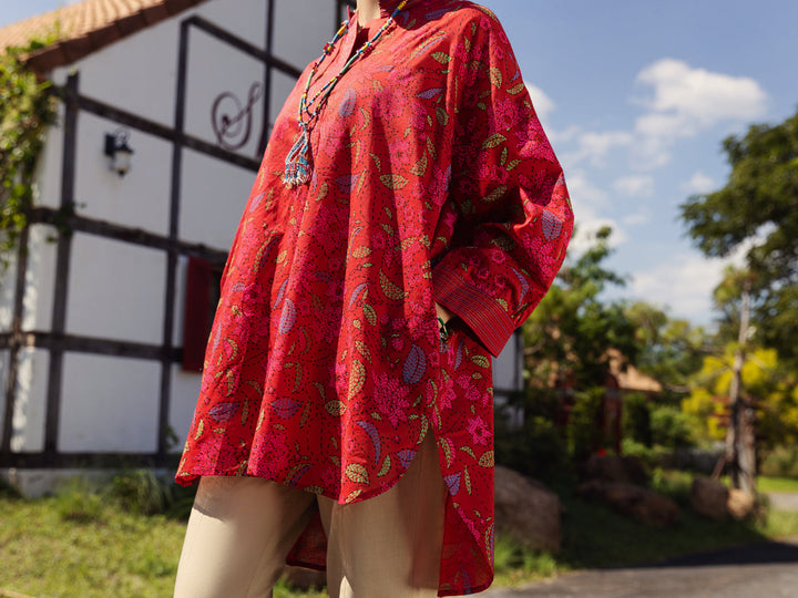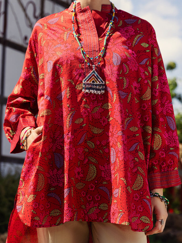 Red Mid-Length Screen Printed Cambric Kurti With Embroidered Band – Plackets Neckline An Embroidered Cuff Sleeves.