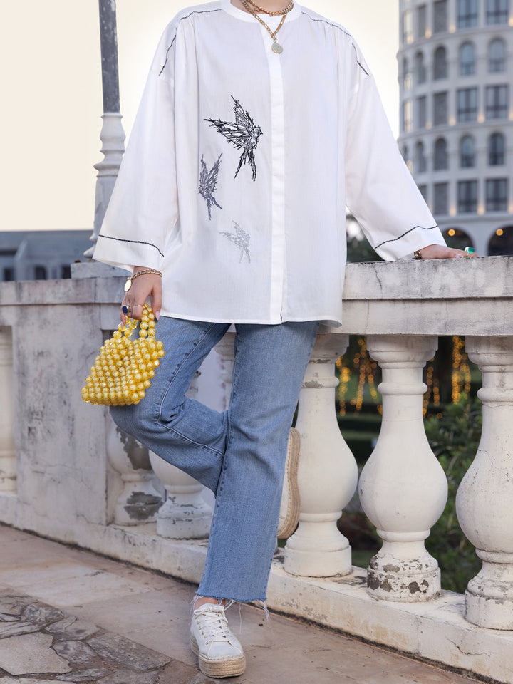 Cambric Hidden Placket Button Down Shirt With Embroidered Applique and Details on Shoulders and Sleeves.