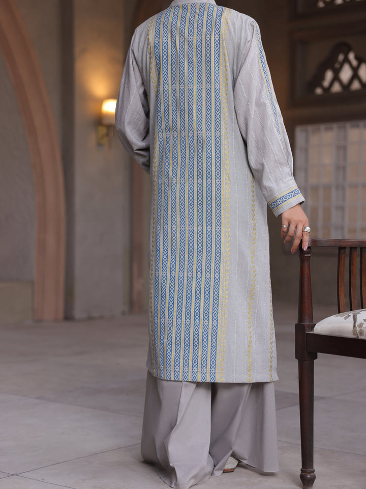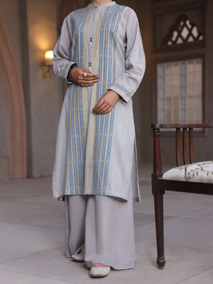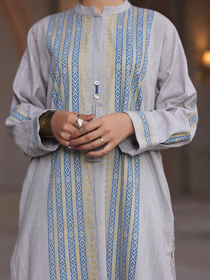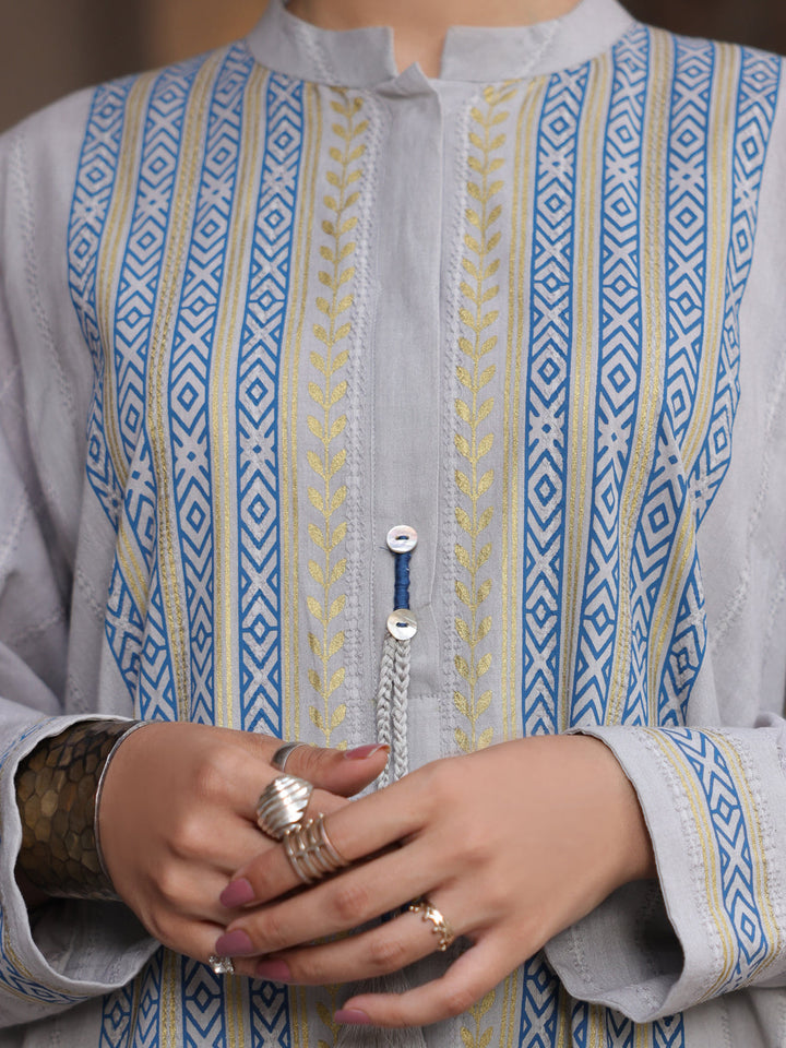 Block Printed Dobby Kurti With Cuff And Band Collar Detailed With Tassel And Button.