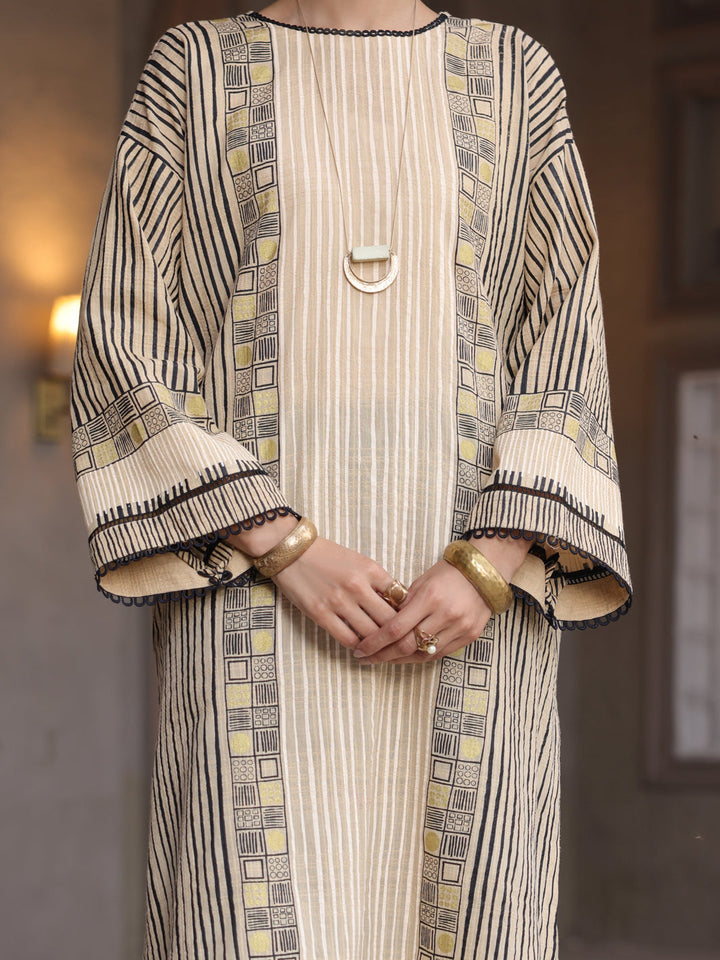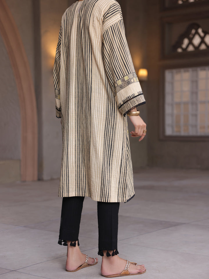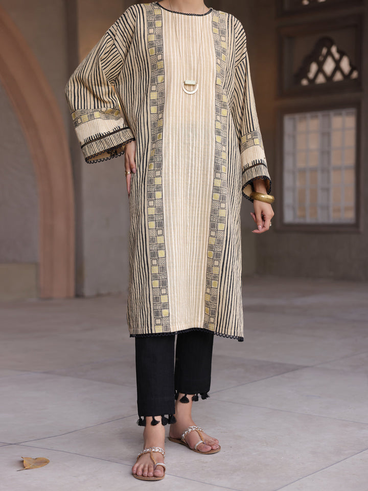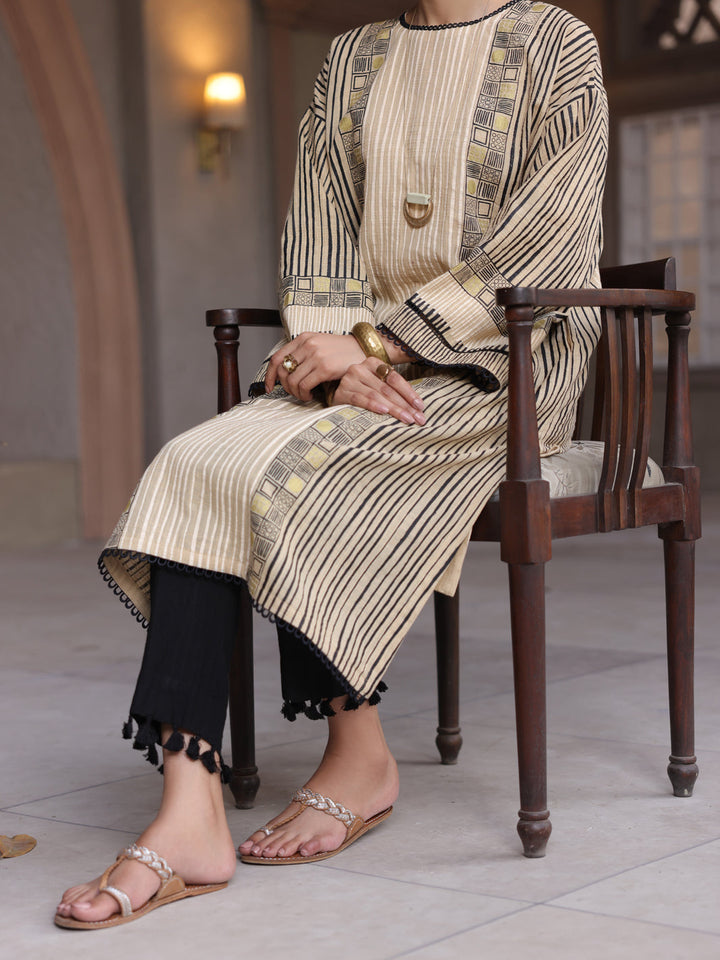 Long And Loose Style Dobby Black And Gold Block Printed Kurti With Lace Details On It.