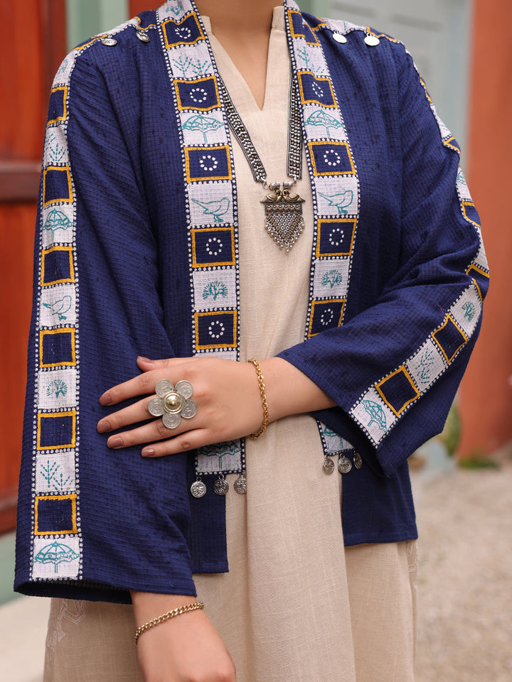 Square Dobby Short Shrug With Block Printed Details On Collar And Sleeves.