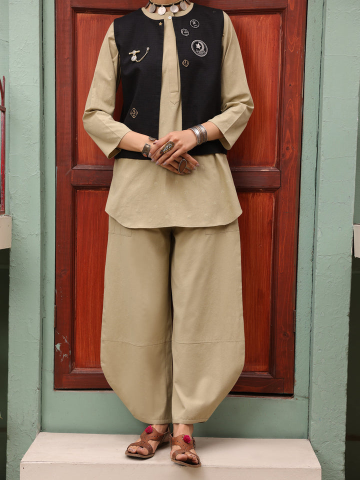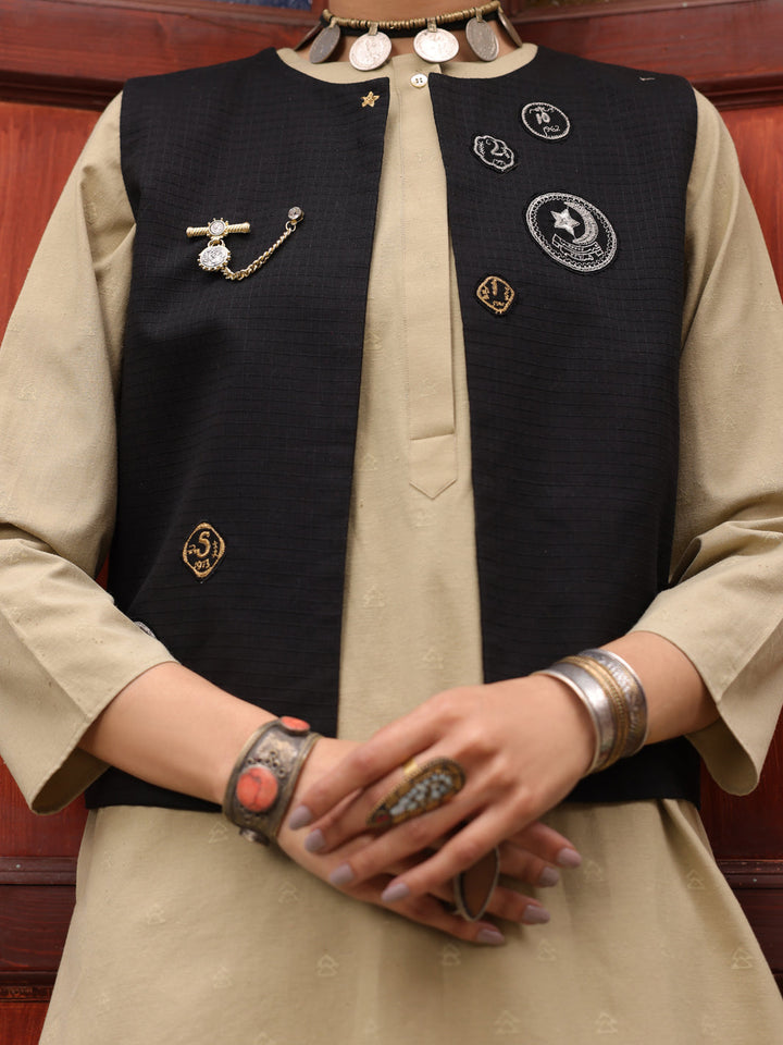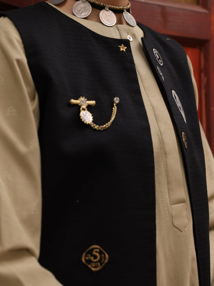 Inspired From The Coins, This Square Dobby Sleeveless Waistcoat Detailed With Brooch.