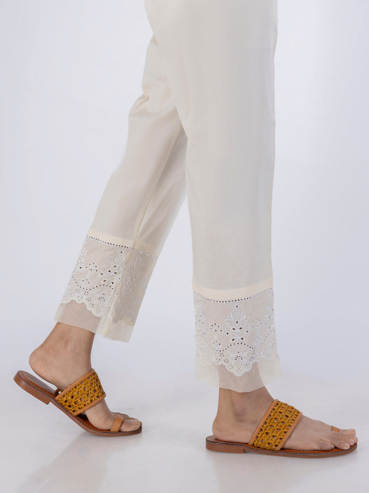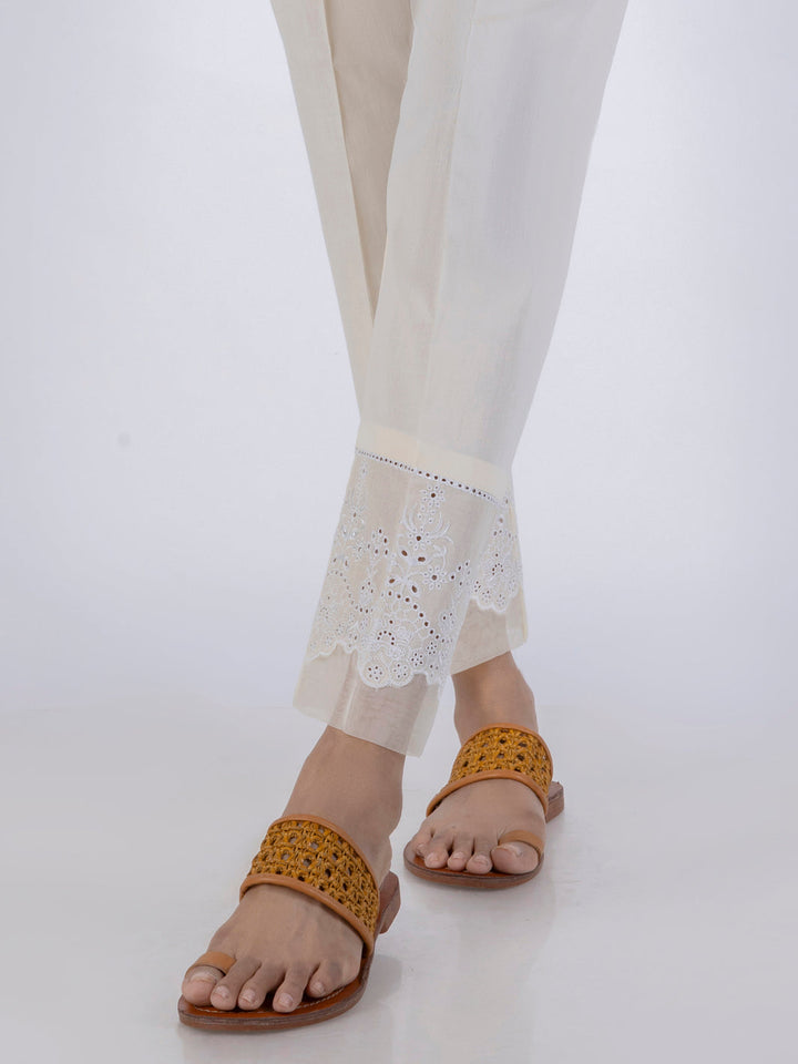 Cambric Fitted Pant With Schiffli Boarder And Organza Detail On Hem.