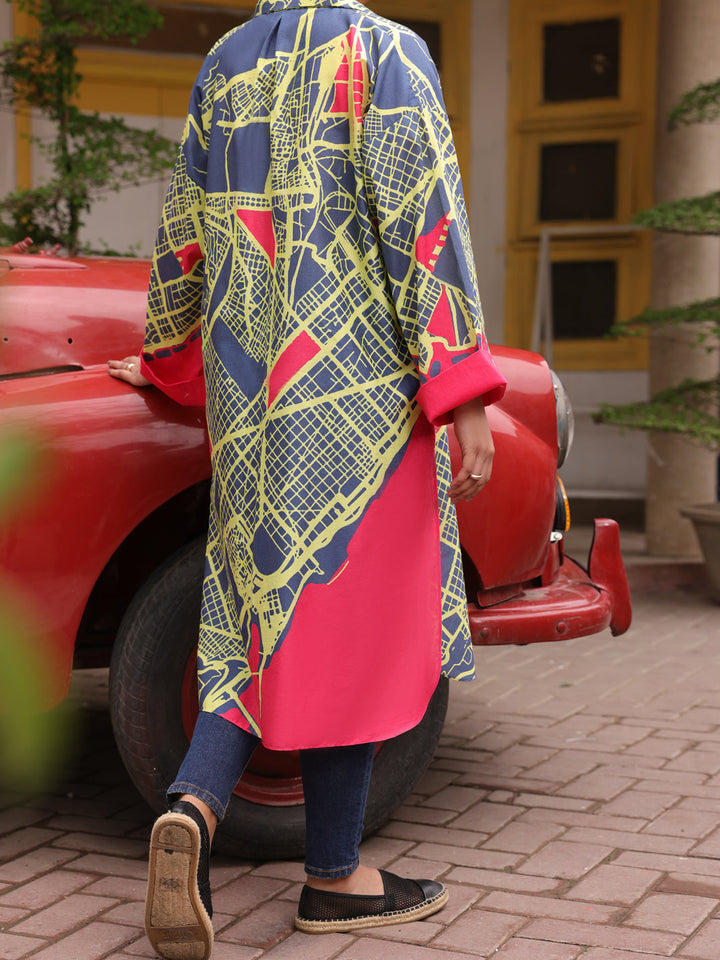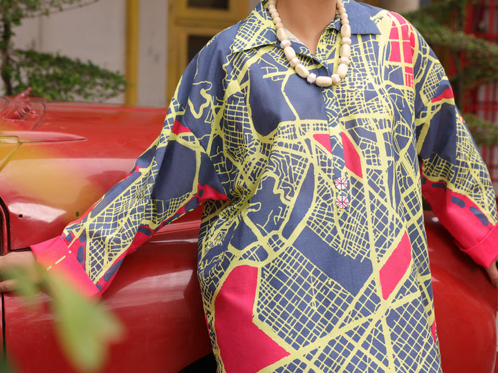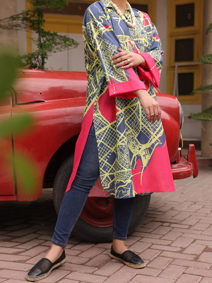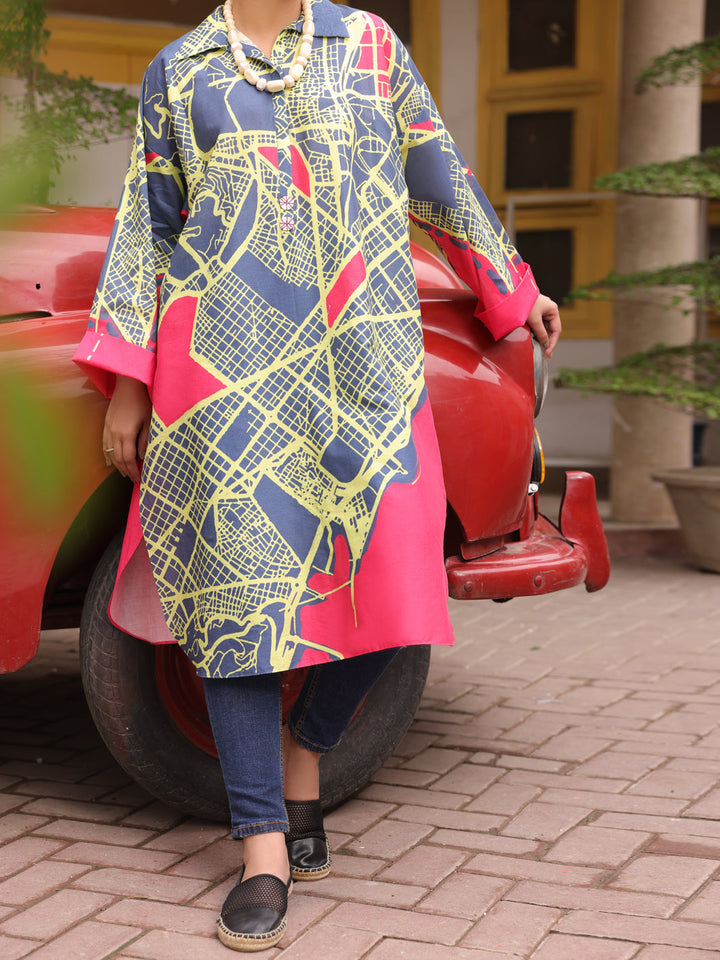 Digital Printed Loose Fit Long Kurti With Collar Neckline And Button Details On Placket With Folded Cuff Sleeves