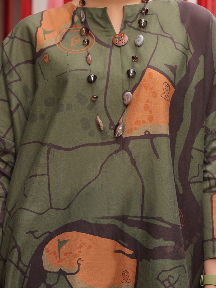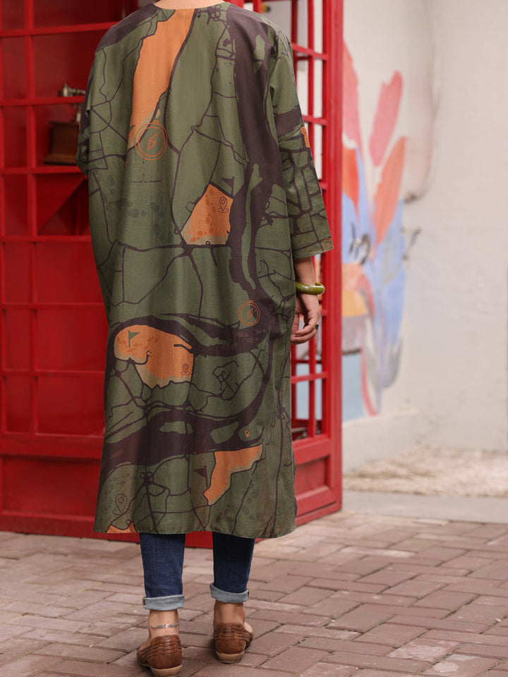 Digital Printed Loose Fit Hi-Low Kurti With Button Details On Small V-Neck