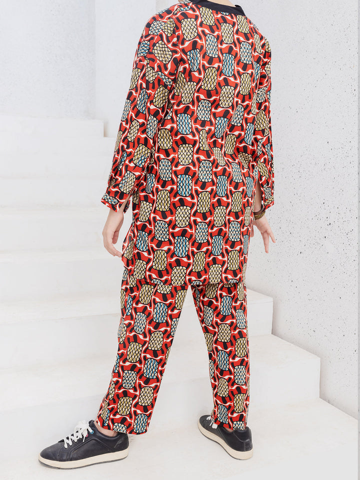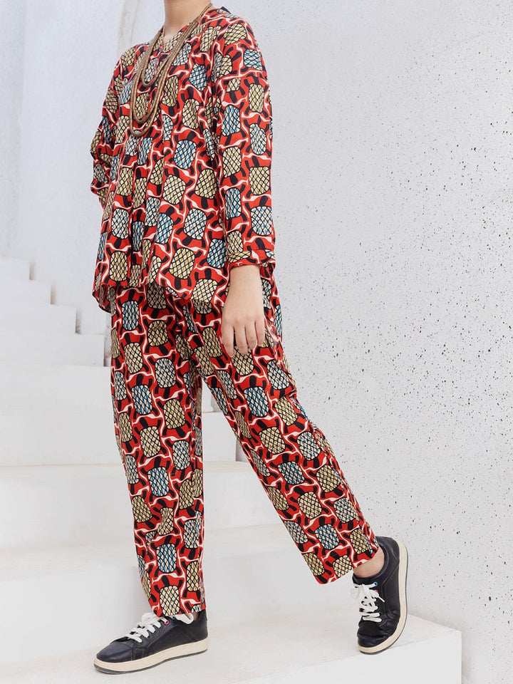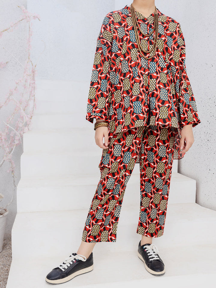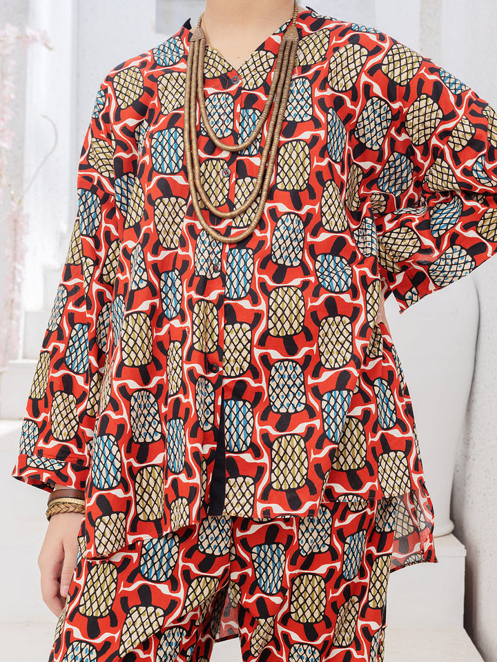 Digital printed cambric co-ord set detailed with button down and hi-low cut line.