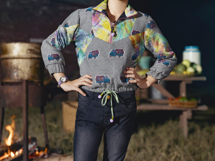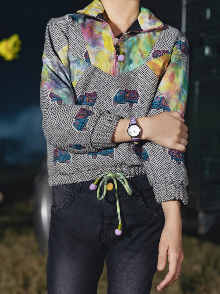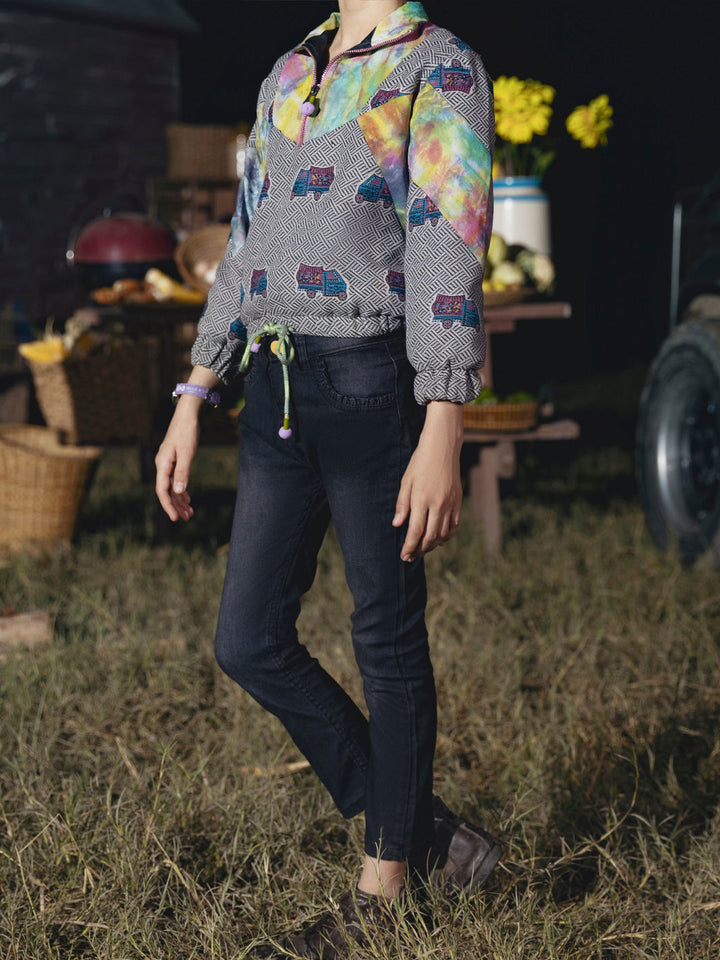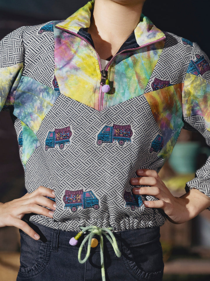 Yarn-dyed bomber style jacket with digital printed patched work with draw string hem and cuff sleeves.