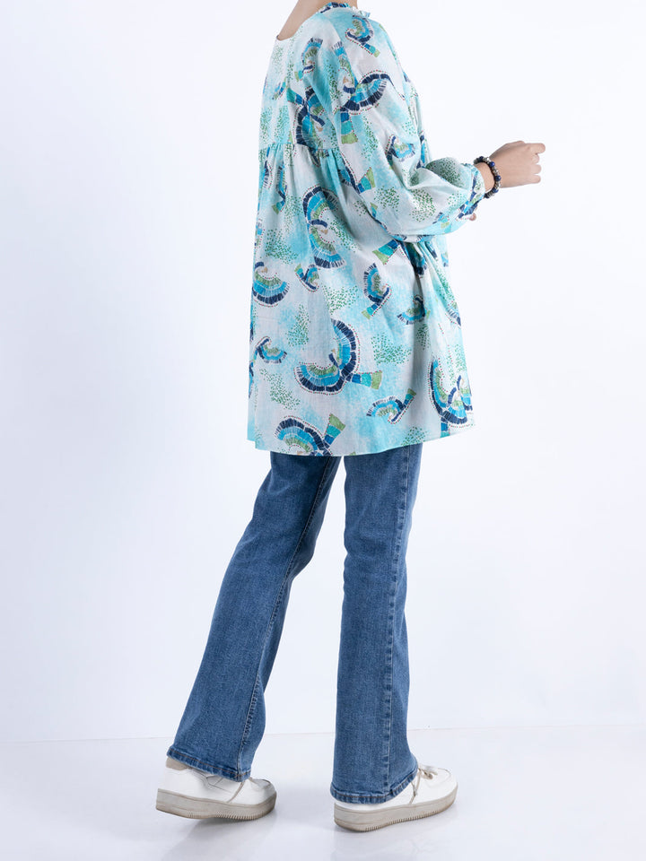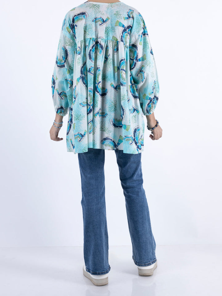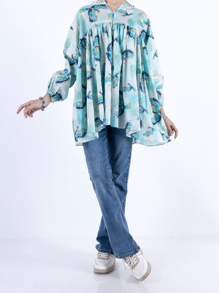 Digital printed gathered button down shirt with gather details on neckline and sleeves.