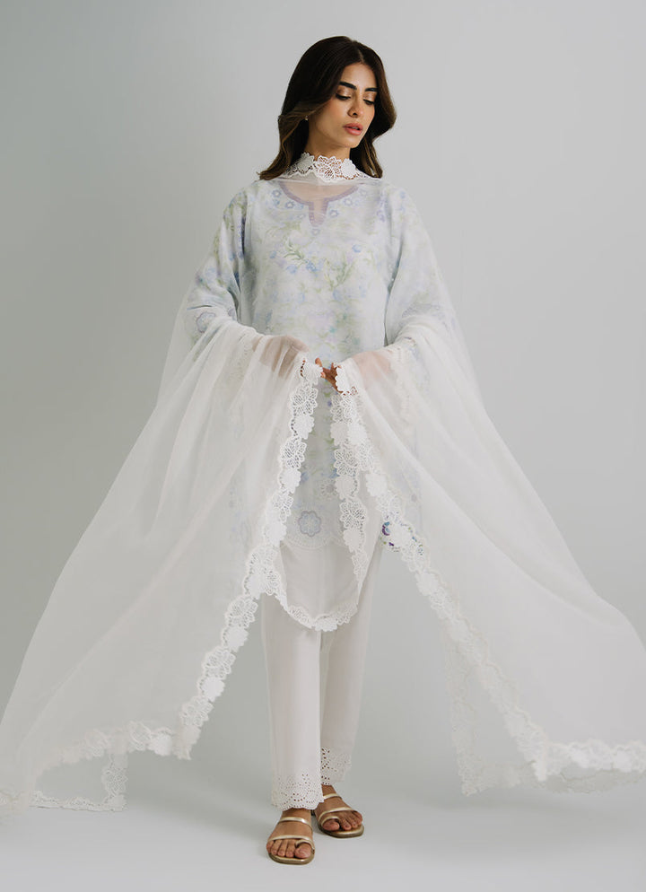 The white chiffon features delicate motifs and applique lace borders meticulously adding a touch of sophistication to your ensemble.