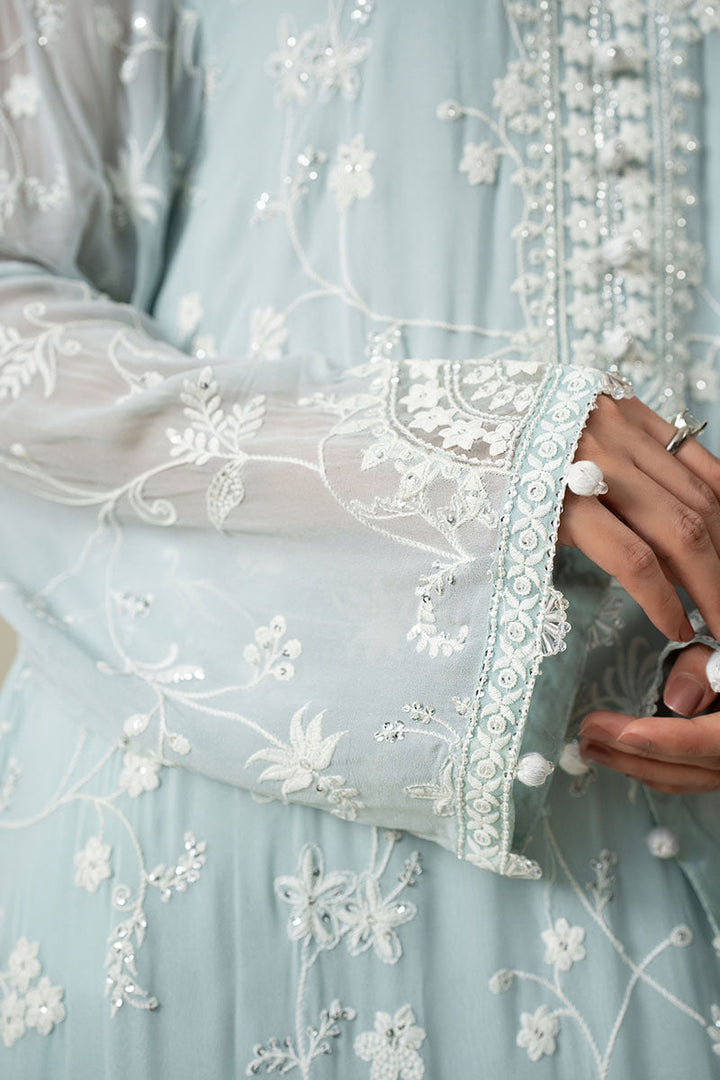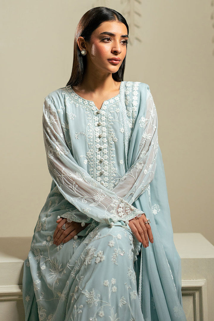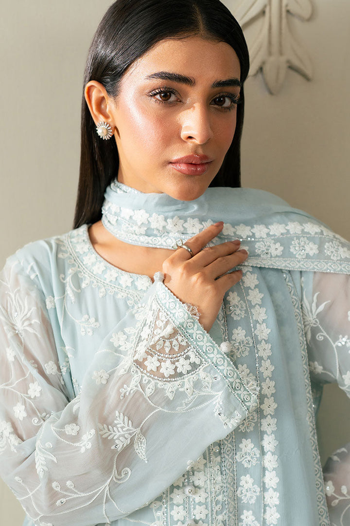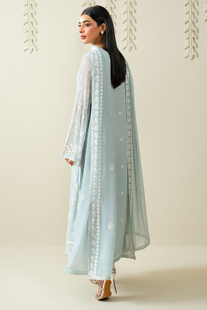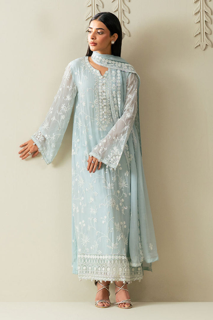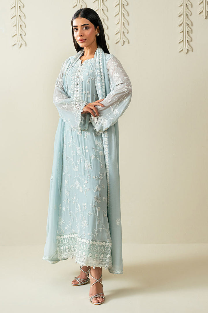 This refined 2-piece set includes a long chiffon shirt featuring detailed front and back dyeing with intricate embroidery. The hem border, neckline, and flared sleeves are accented with stylish tasseling, adding texture and sophistication. Accompanied by a matching chiffon dupatta that is dyed and embroidered, this ensemble offers an elegant, cohesive look perfect for formal occasions or elevated daywear.