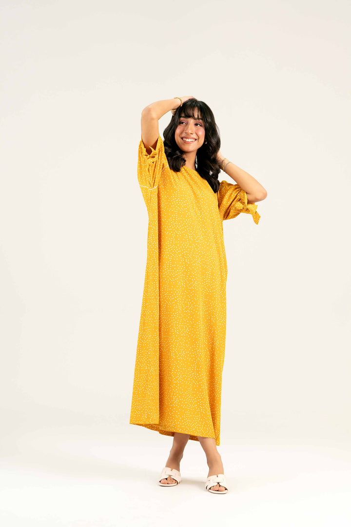 Round Neckline, Gathered Reglan Sleeves With Straps, Printed Long Dress