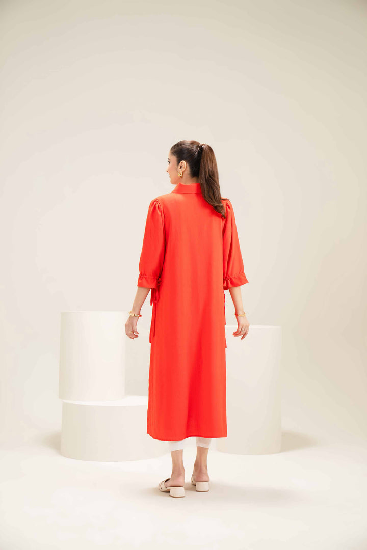 Front-open long dress featuring a pointed collared neckline, sequin-embroidered front, and drawstring sleeves with gathered detailing.