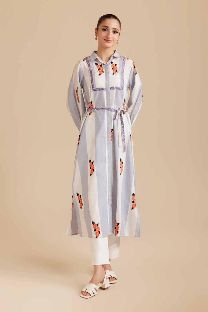 Long dress featuring a collared neckline, tie-up detail sleeves, embroidered side slits, and a front placket, complete with an embroidered long belt.