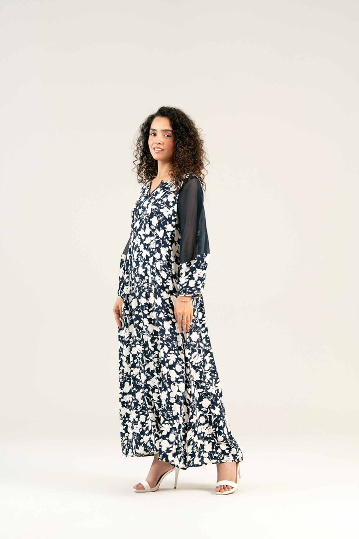 Round Neckline With V Slit, Organza & Pearls Detail On Sleeves, Waist Pleated Long Dress