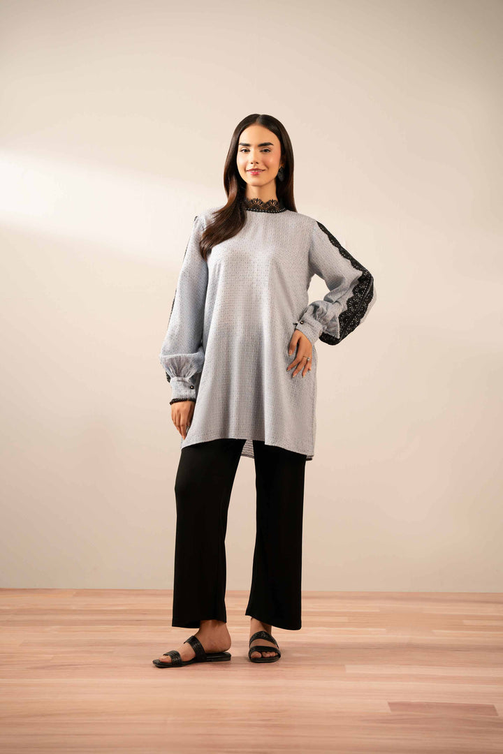 Tunic With Lace Detail On Band Neckline And Sleeves, Gathered Cuff Sleeves